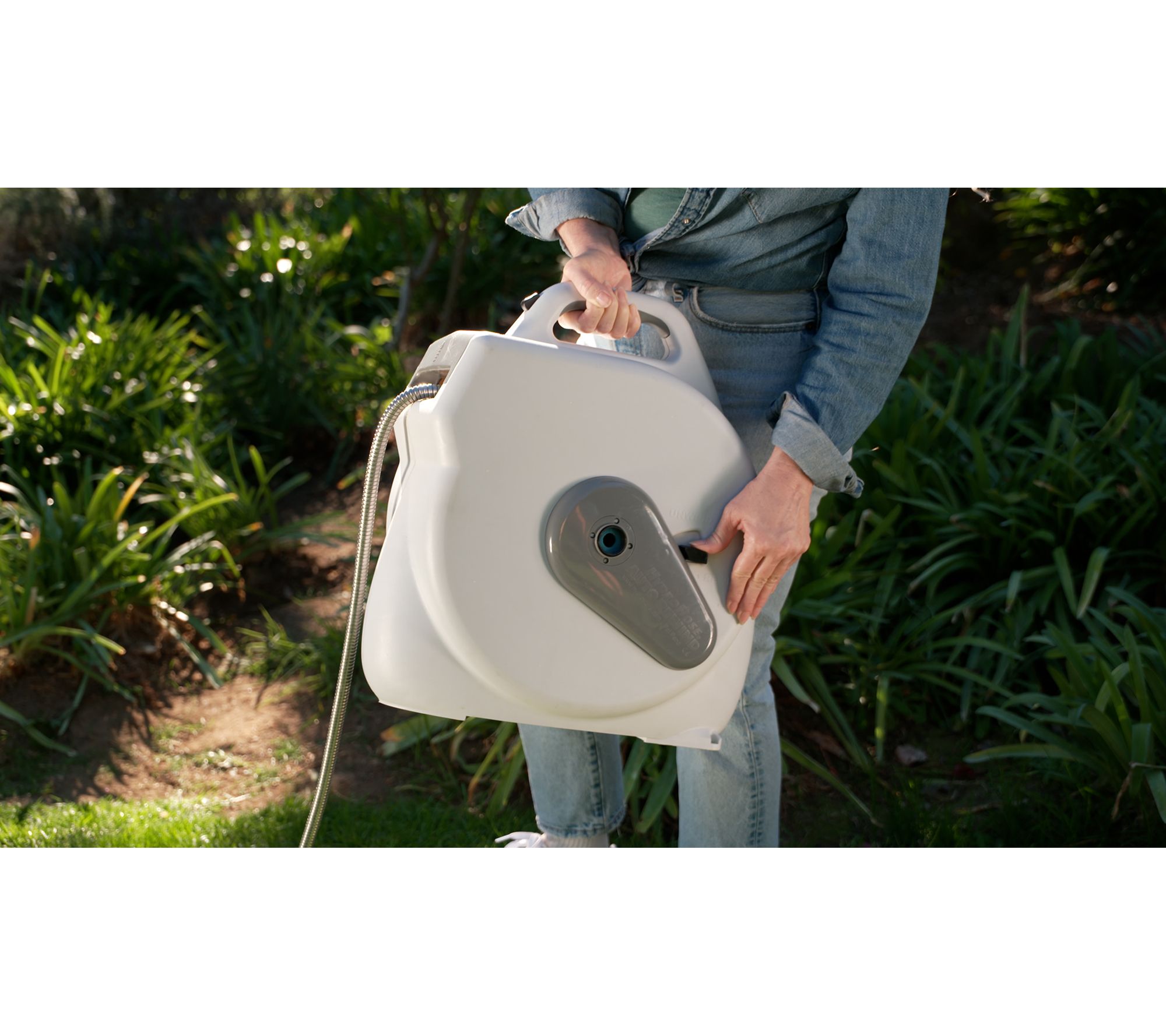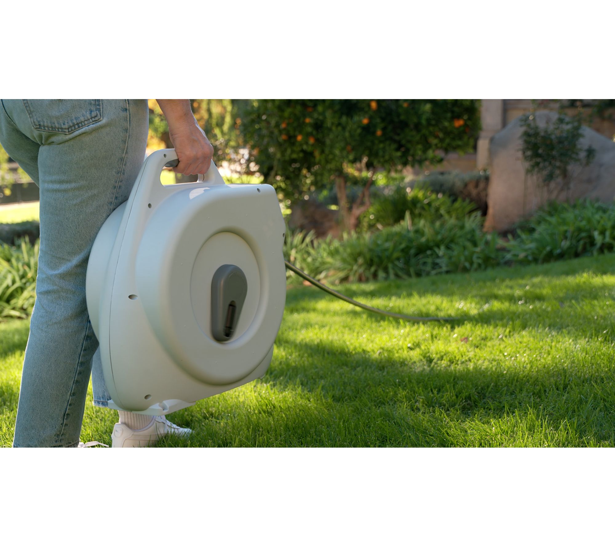 Includes automatic hose reel, 40' metal garden hose, and fireman hose nozzle