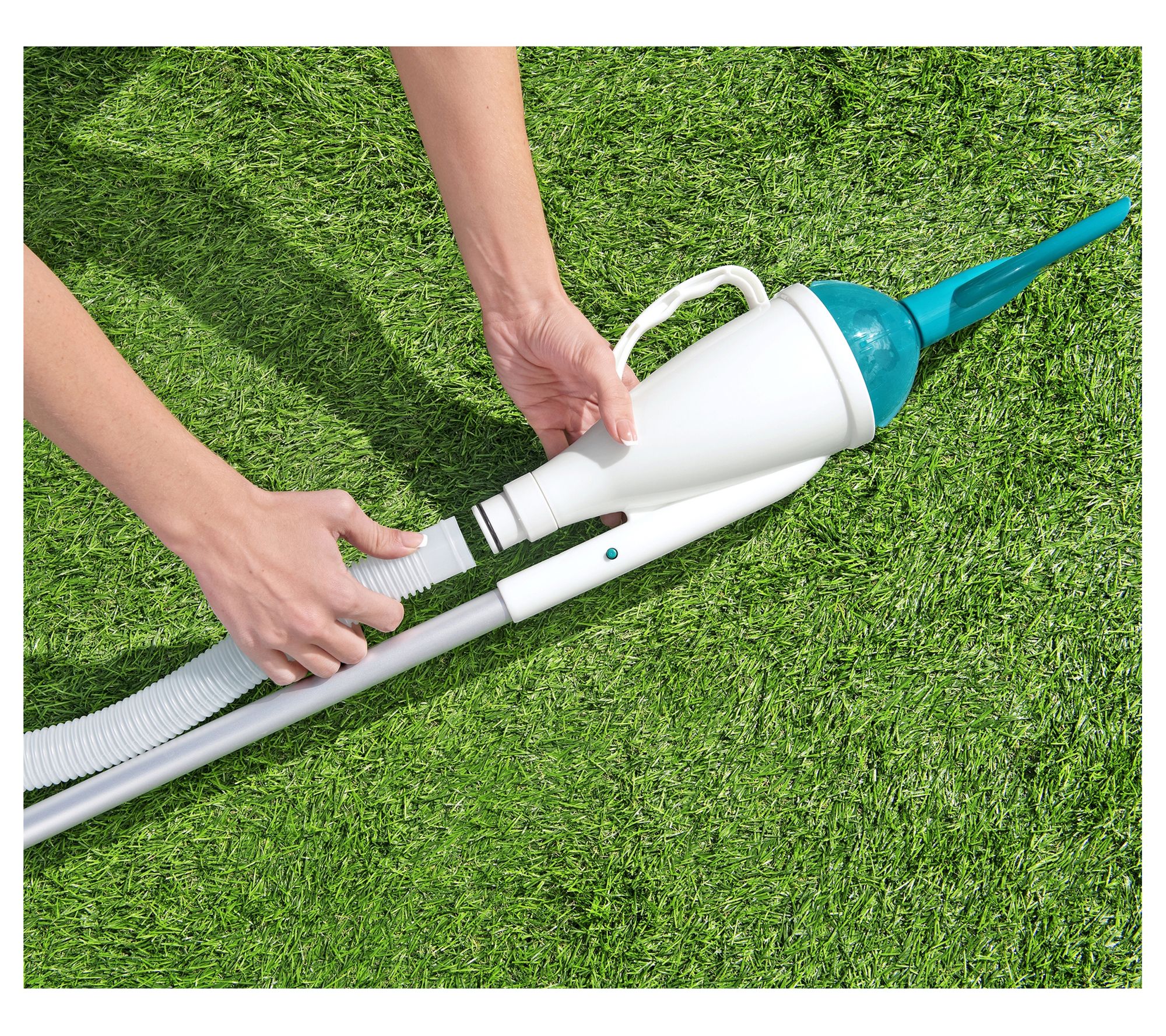 Keep your pool water crystal clean with the AquaPristine pool vacuum, a versatile cleaning solution that's both simple to set up and easy to use. With the ability to attach to your filter pump using one of the included adapters, this vacuum efficiently suctions out dirt, leaves, and other debris into a removable and reusable bag. Featuring two interchangeable nozzle heads for scrubbing grime or taking care of loose debris, and a pole that breaks down for compact storage, it's the perfect accessory for maintaining above-ground pools. From Bestway.