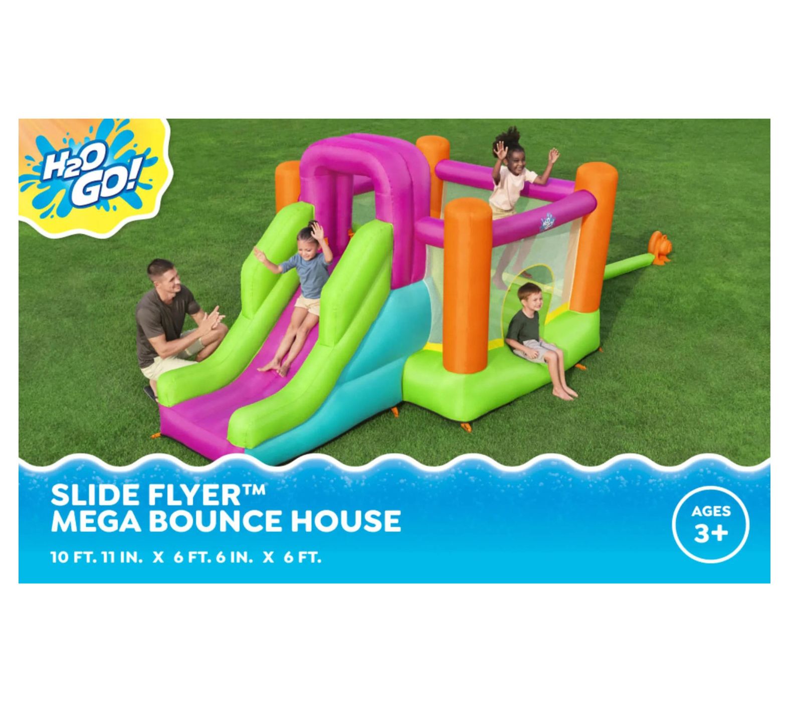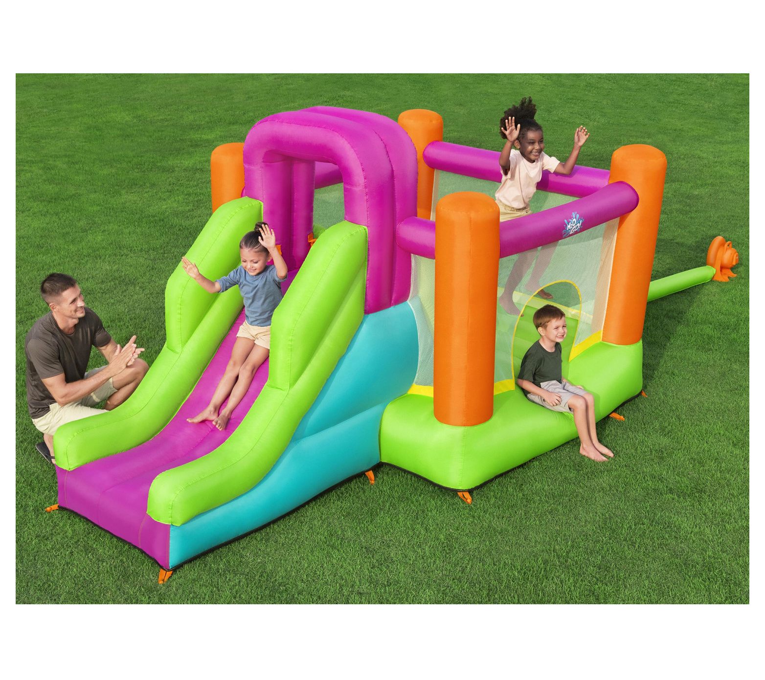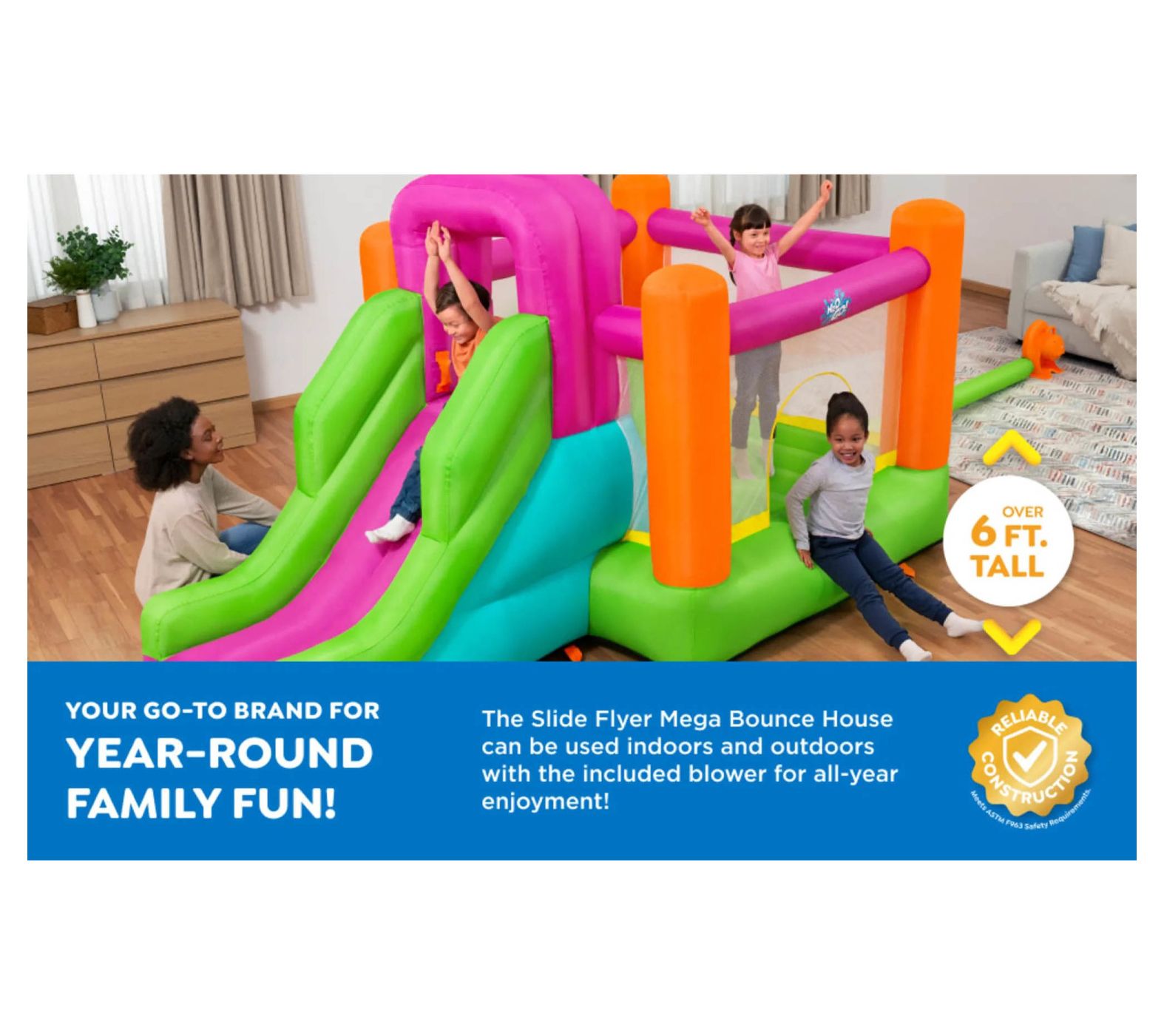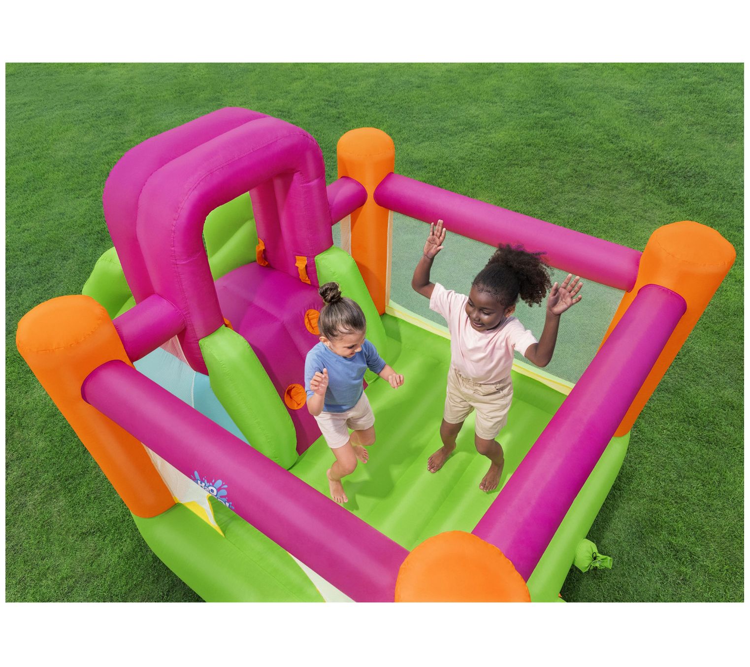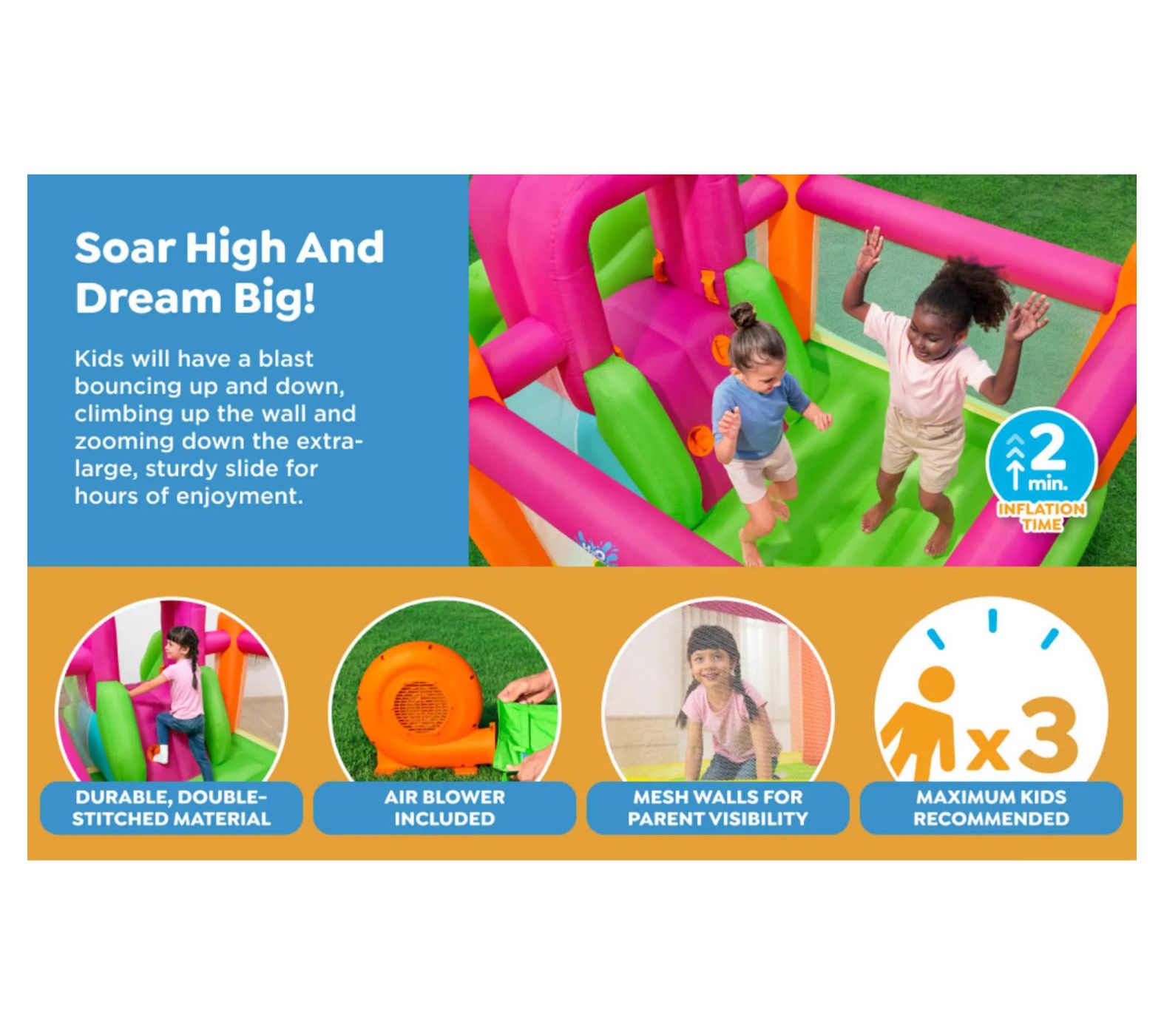 Make every backyard moment an adventure with the Bestway Flyer Inflatable Mega Bouncer Slide. This vibrant bouncer, complete with a climbing wall and footholds, ensures hours of fun. Kids can bounce safely with mesh sidewalls providing visibility for parents, and the heavy-duty blower inflates the bouncer in less than two minutes so playtime can start quickly. Durable and suitable for indoor and outdoor use, it promises year-round enjoyment. From Bestway.
