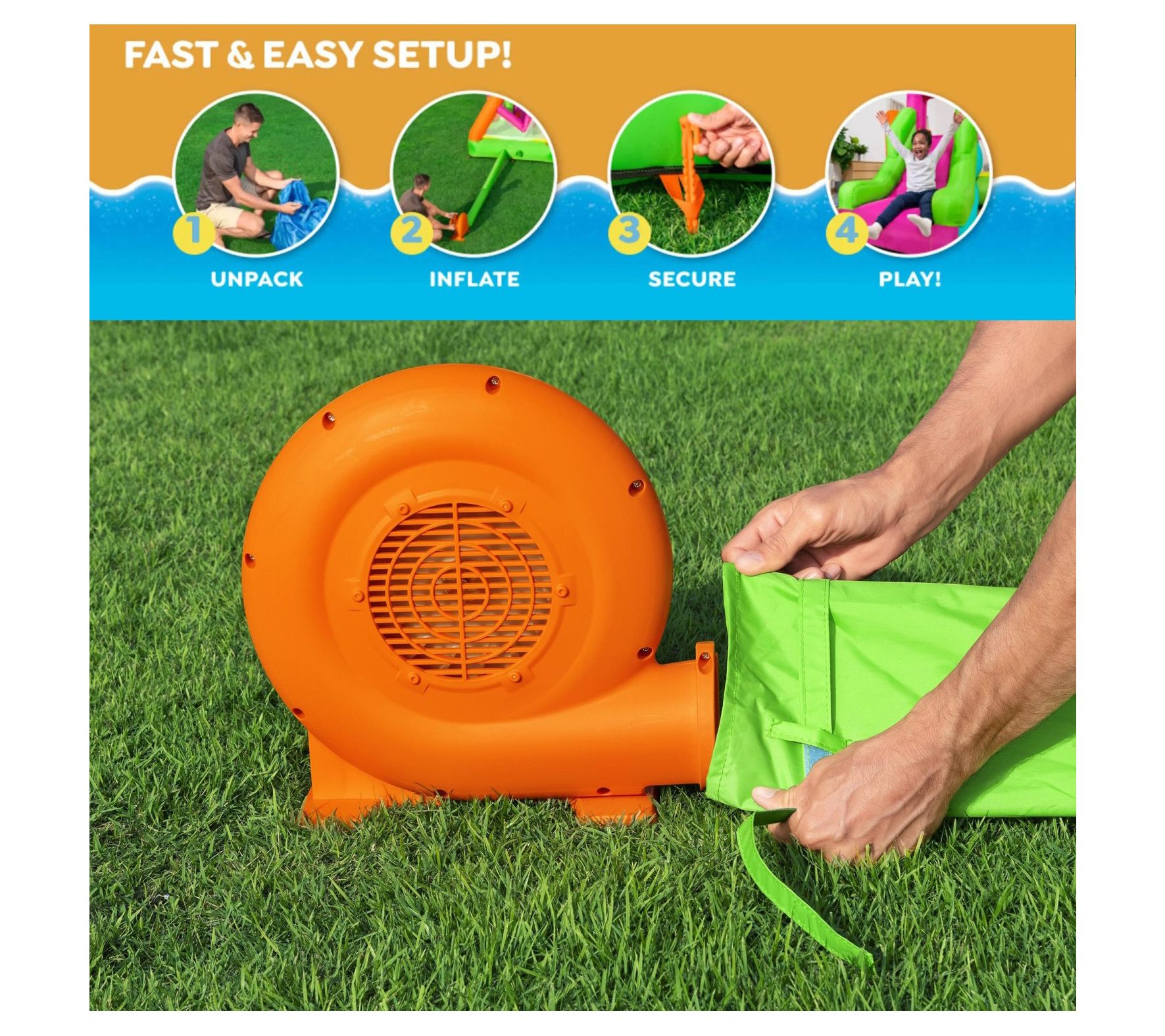 • Includes bouncer, blower, storage bag, 11 bouncer stakes, two blower stakes, and repair kit with multiple patches