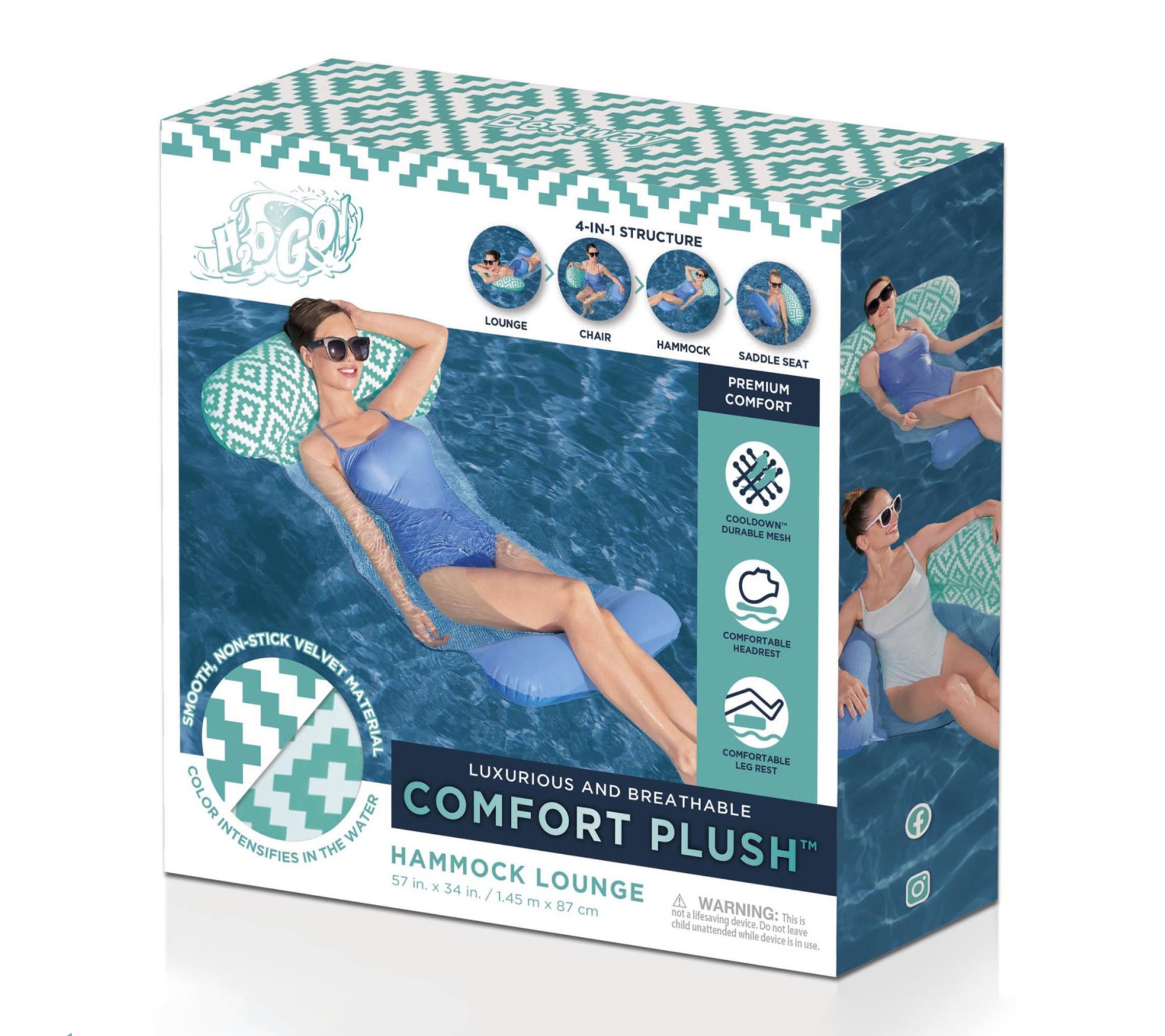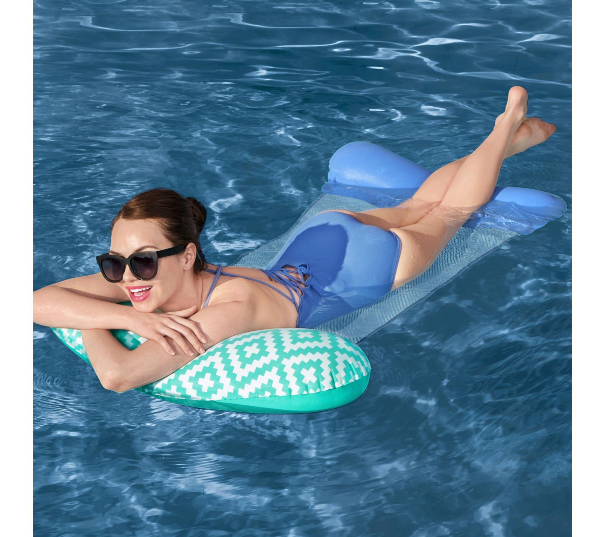 Sink into leisure as you drift across the pool on this plush hammock float, designed with velvety soft fabric and innovative mesh seating that keeps you cool under the summer sun. Whether lounging, sitting or reclining, the customizable structure and ultra-cushioning headrest let you relax comfortably while vibrant colors intensify in the water for an eye-catching look. From Bestway.