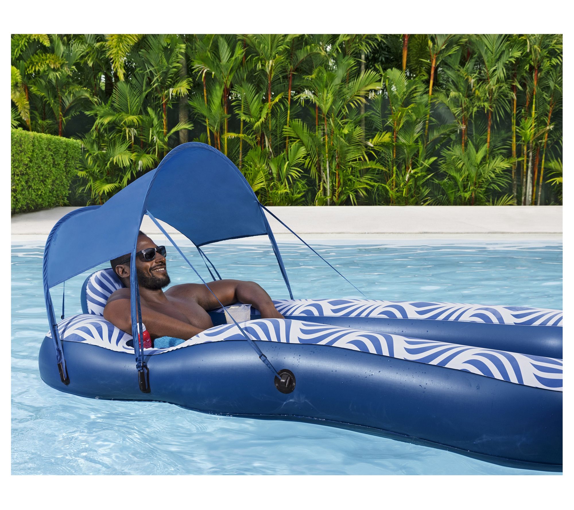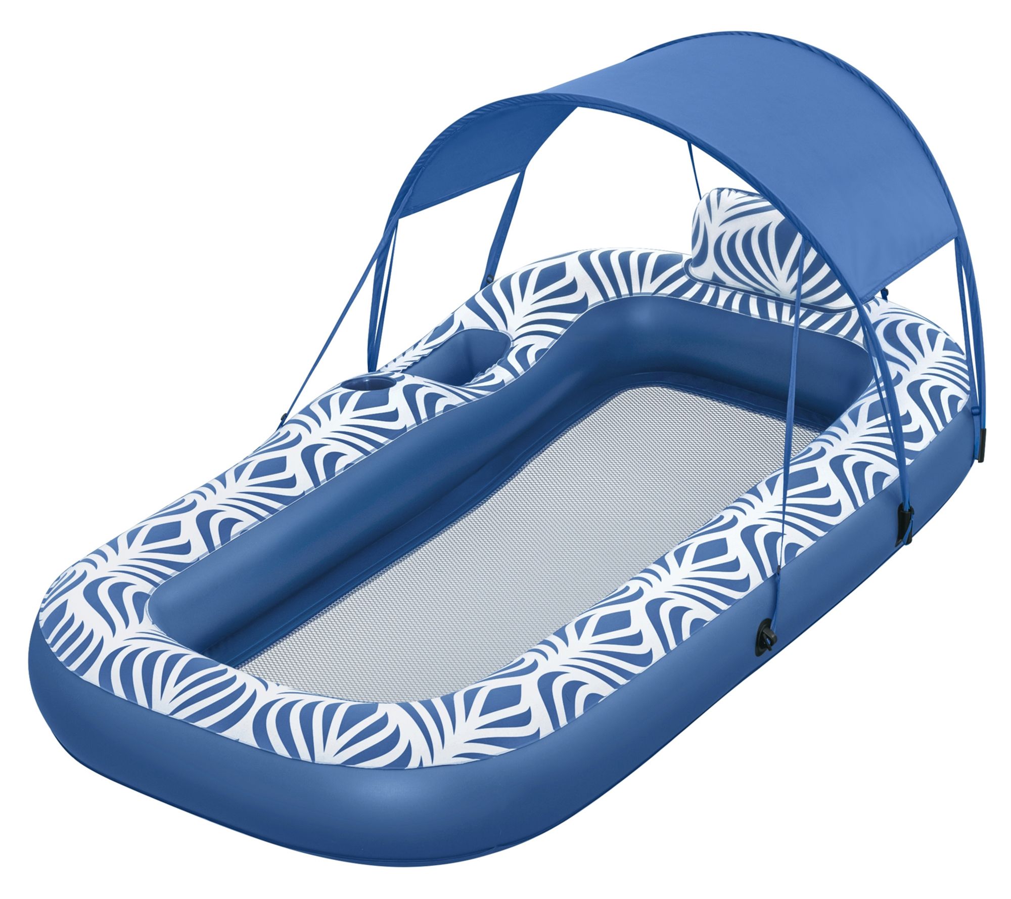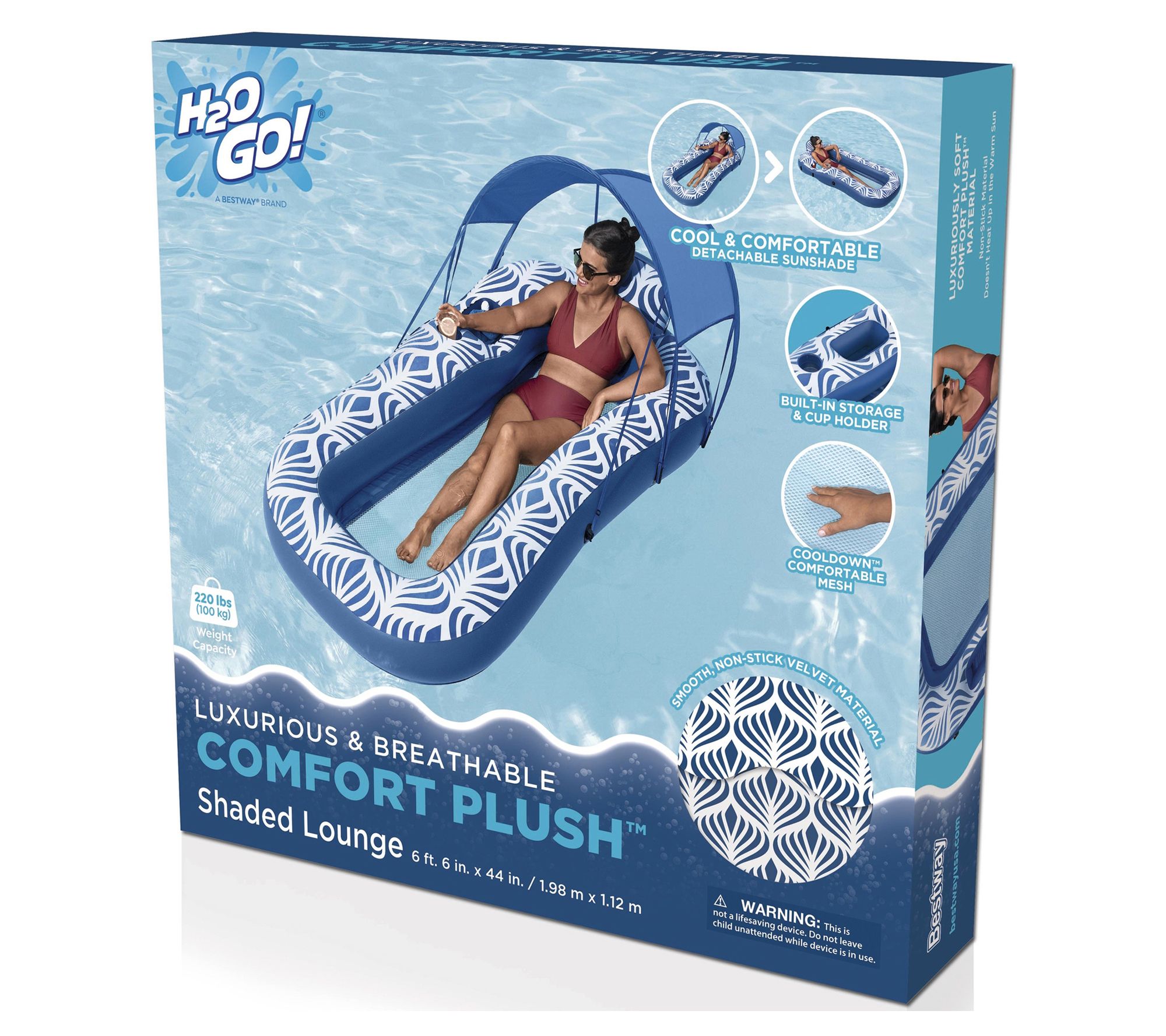 Relax in style and comfort with the H2OGO! shaded pool lounger. Designed with luxurious velvety material for a soft and smooth texture, this float keeps you cool with its mesh seating area just below the water's surface. Plus, the detachable sunshade shields you from the rays, while the built-in cup holder and storage compartment add convenience to your lounging experience. From Bestway.