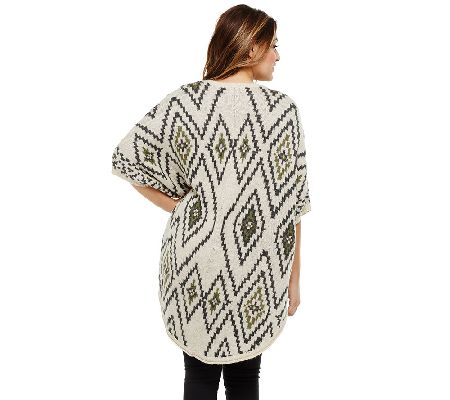 Features: jacquard pattern, open-front cocoon style, short dolman sleeves, curved hem, side notch slits