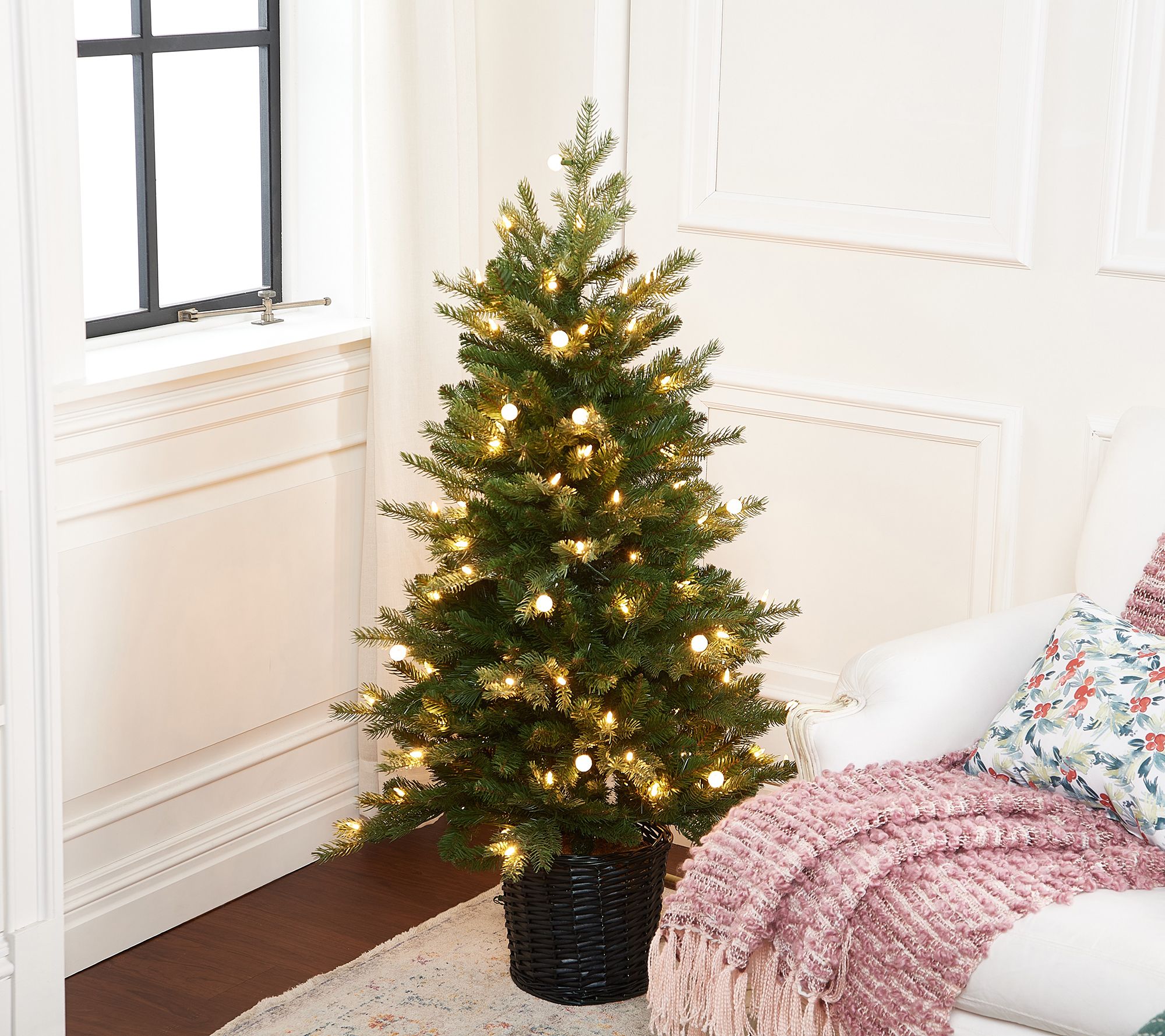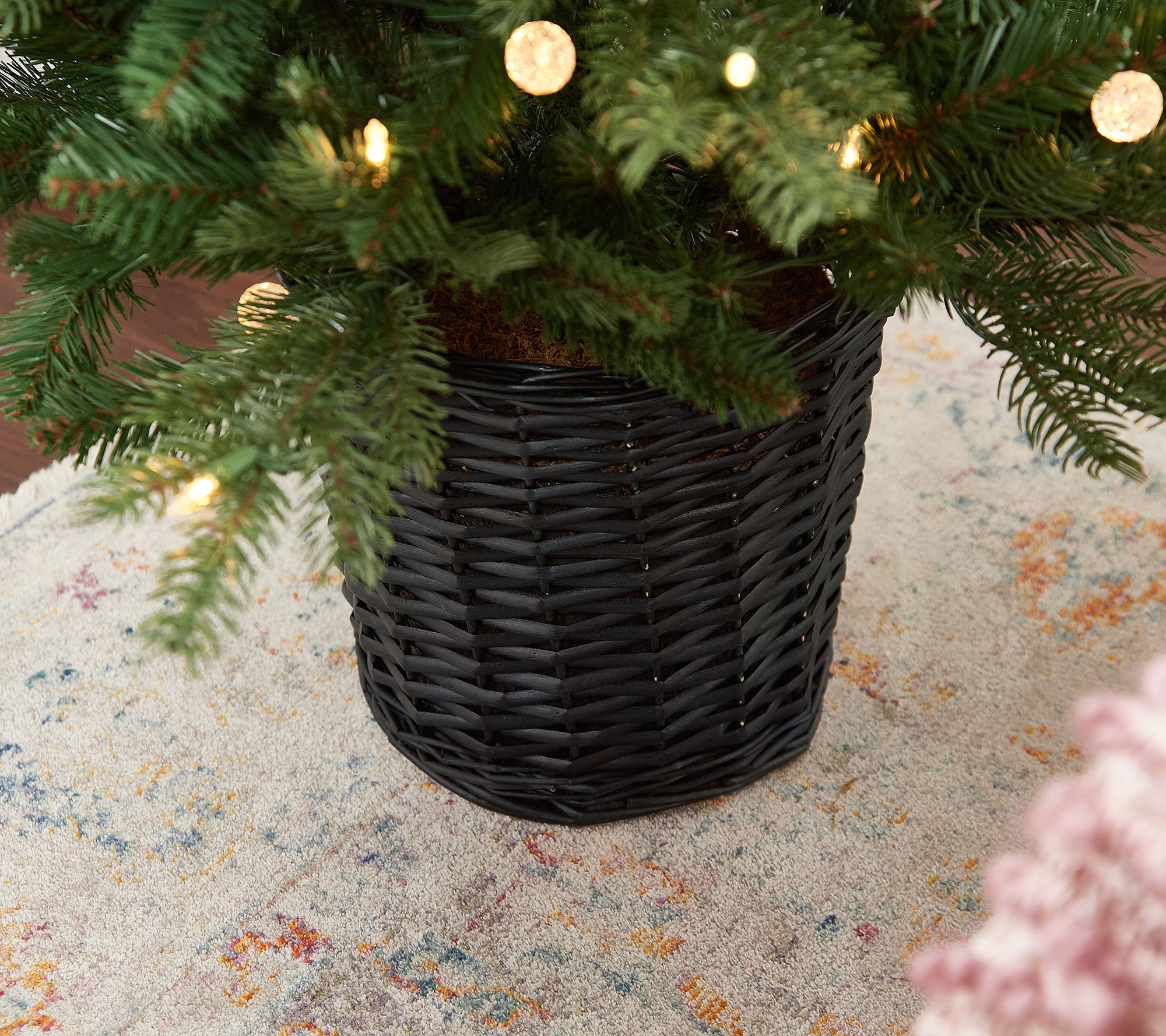 • Includes lifelike prelit mixed bulb tree in black woven basket
