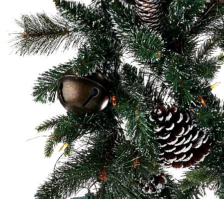 Green foliage adorned with jingle bells and pinecones