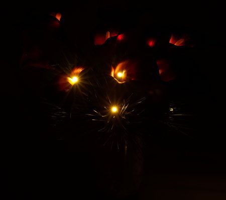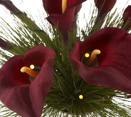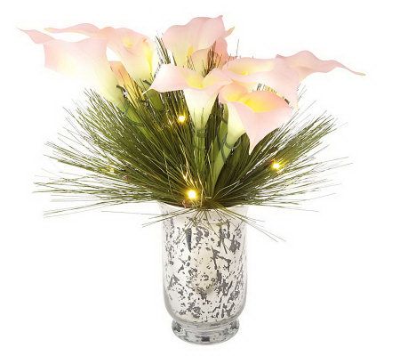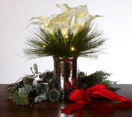 All is bright this holiday season. Prelit lifelike calla lilies rest among pine needles to form the beautiful arrangement. A faux mercury-glass vase with slightly curved detailing embraces the festive bouquet. Set the timer, and the warm-white lights will glow for six hours at the same time every day. From Bethlehem Lights.