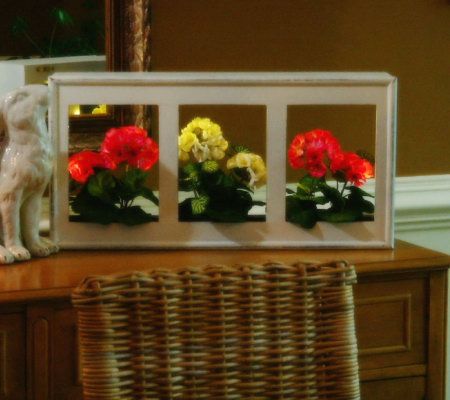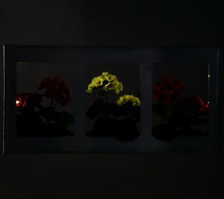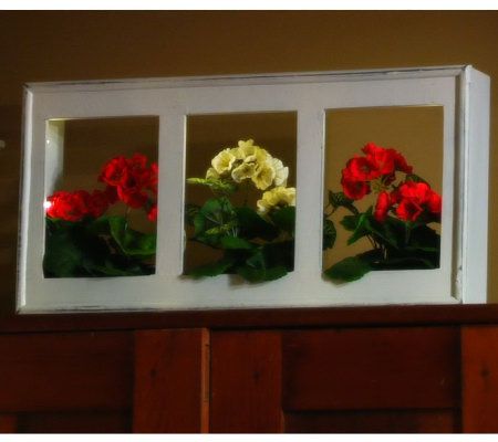 Dress your home for spring year-round with this lovely floral frame windowpane. Three realistic geranium arrangements are prelit with 14 LED lights for a warm, inviting glow. From Bethlehem Lights.