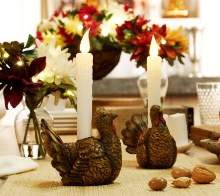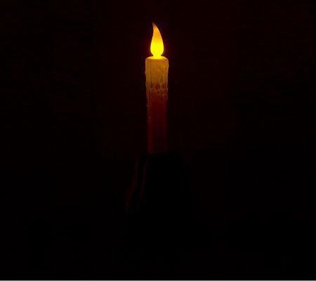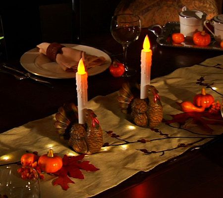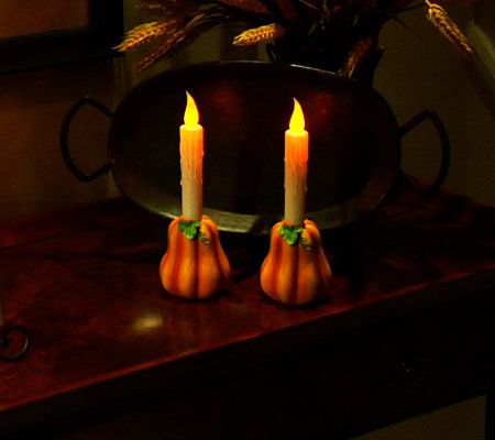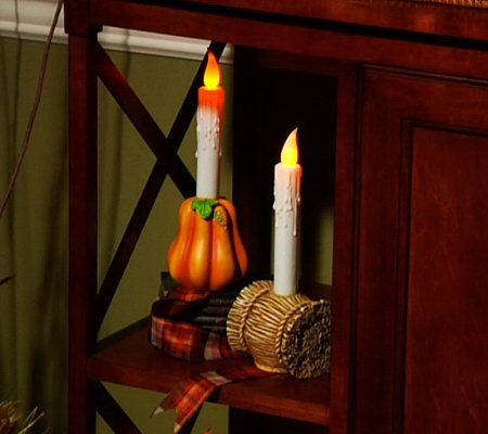 Autumn decorating, made easy and mess-free. Fun, harvest shapes adorn the base of these battery-operated candles, which are a perfect accent for tabletops, mantels, or bookshelves. A faux flickering LED candle flame and simulated melting wax drippings give them a realistic look. From Bethlehem Lights.