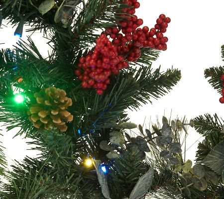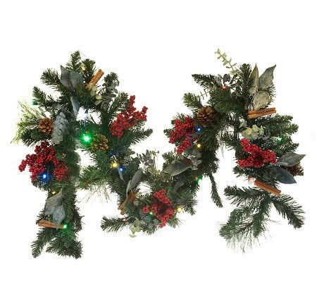 Your holiday home just isn't complete without festive garland. So, finish your decor with the seasonal splendor of this battery-operated pepperberry version. Rich greens, composed of eucalyptus and leaves, combine with red berries, pinecones, and lifelike twigs to create the beautiful accent. And it's prelit with 25 LED lights to add the perfect touch of festive glow--set the timer, and the garland will light up for six hours every day. From Bethlehem Lights.