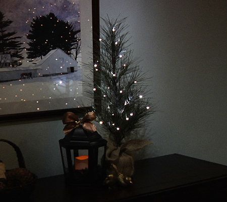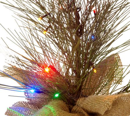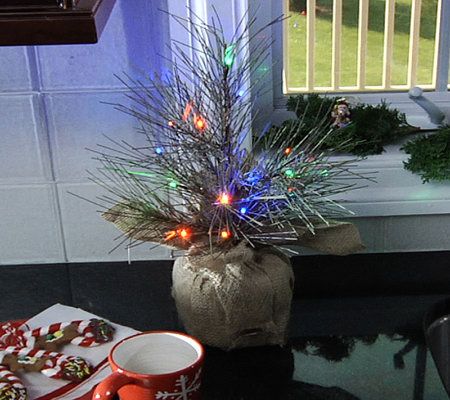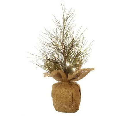 The charm of yesteryear in a modern design. A burlap base conceals the bottom of this lifelike twig tree, which glows with 14 LED lights. Place it anywhere you desire--because it's battery operated, there are no messy cords; and the battery box is cleverly concealed by a covered hook-and-loop flap. Set the timer, and the beautiful holiday accent glows for six hours. From Bethlehem Lights.