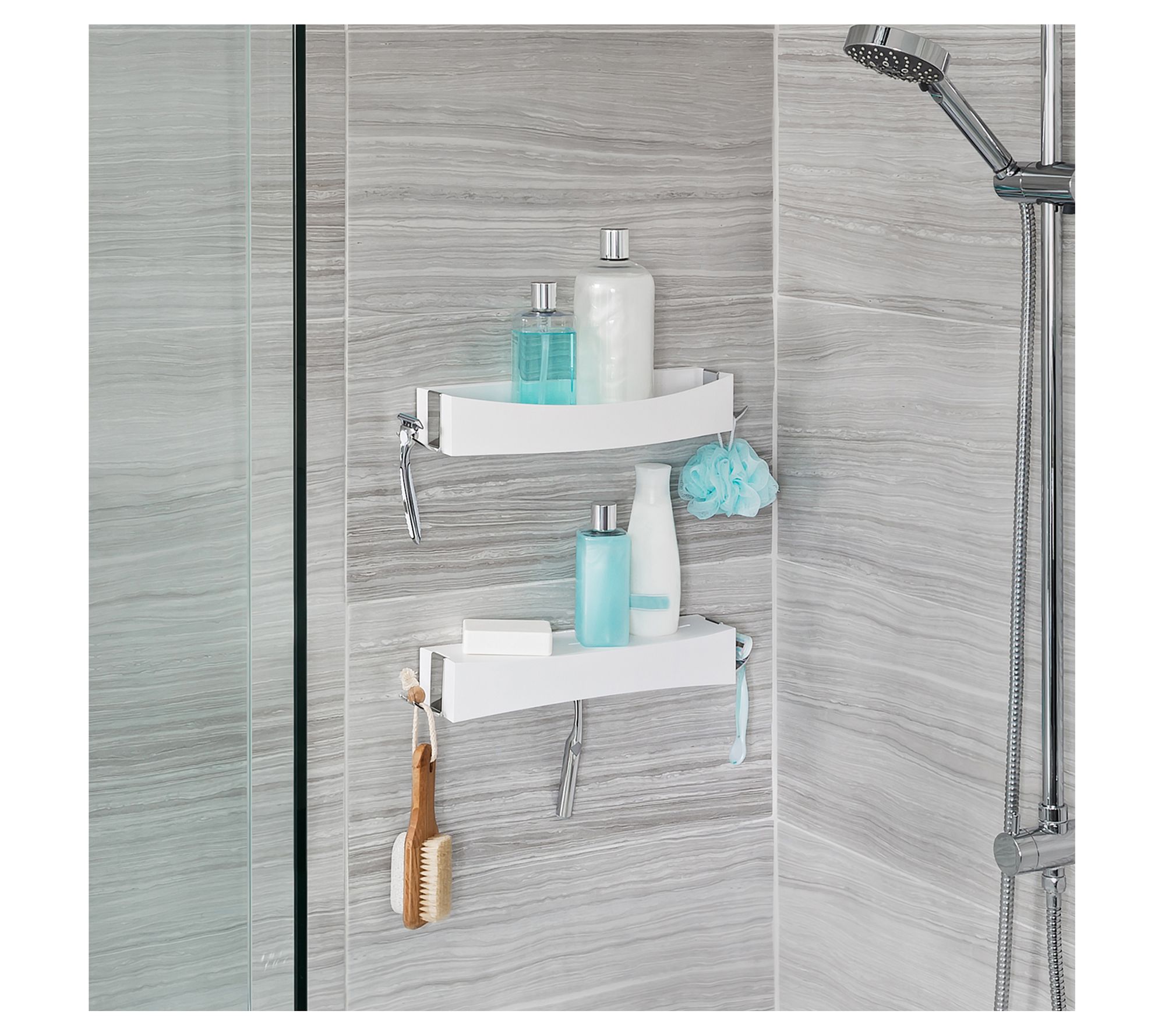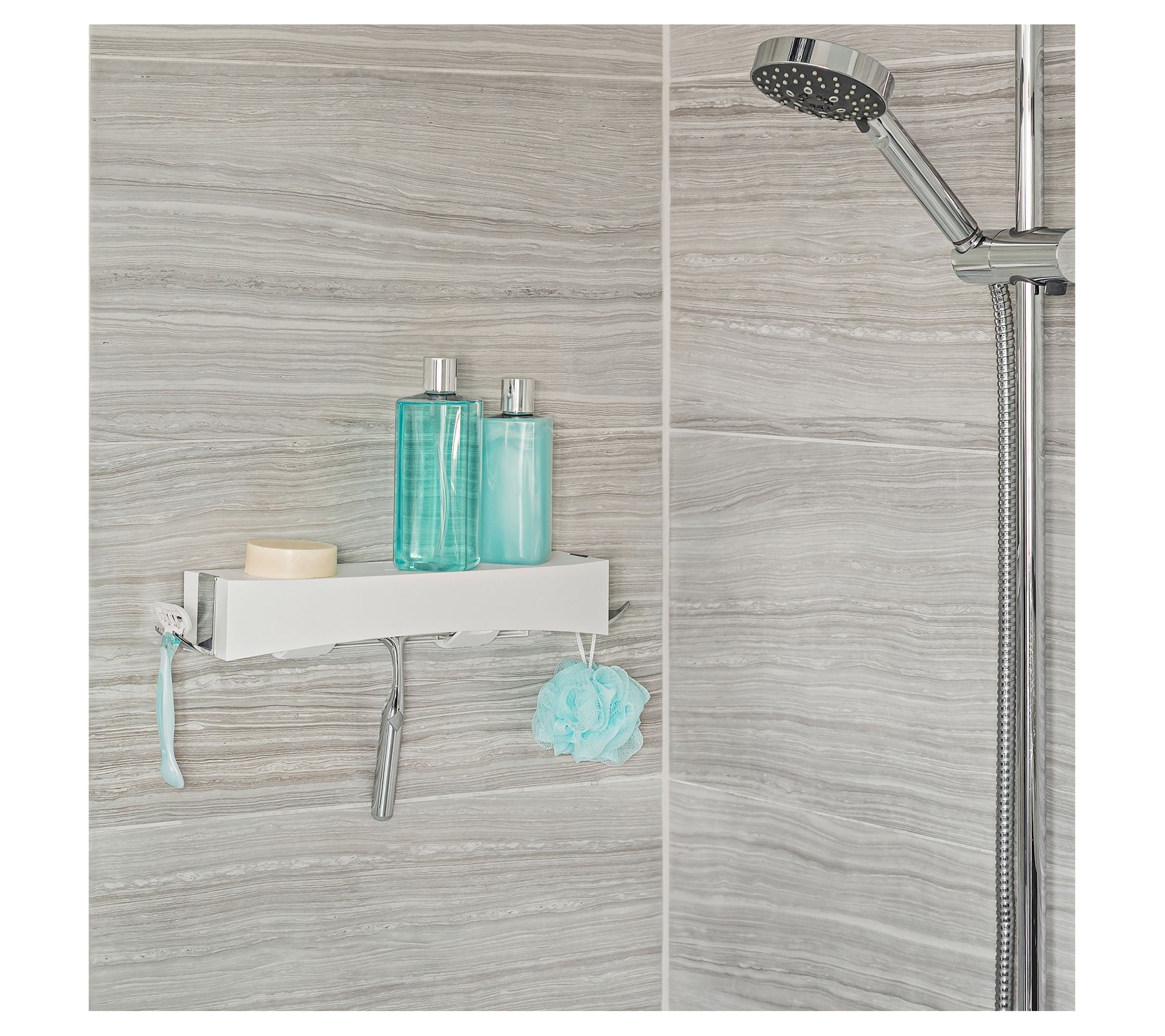 • Includes shower shelf with hooks, silicone glue, and double-sided tape