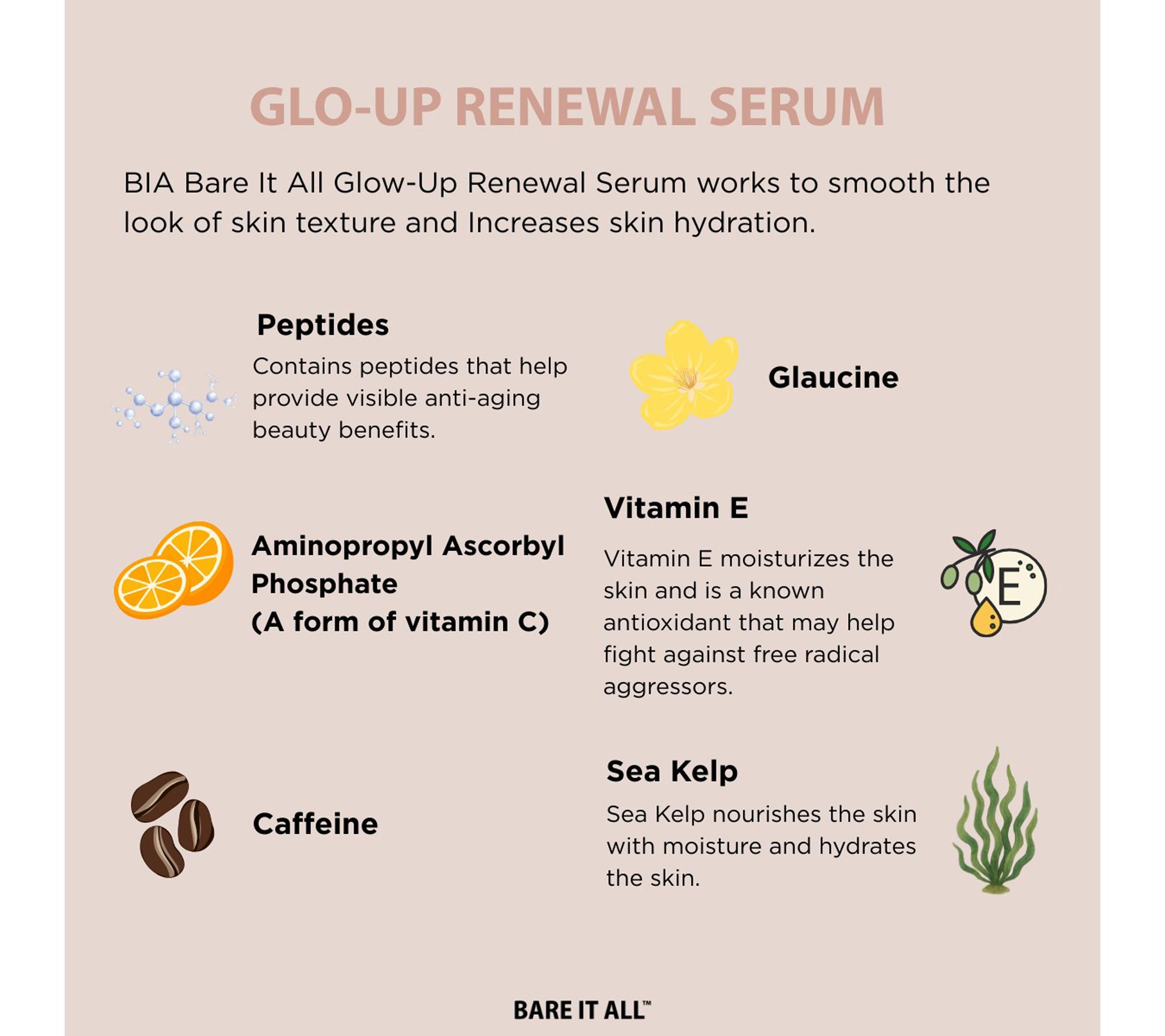 From BIA Bare It All, Glow-Up Renewal Serum is created with ingredients such as peptides, caffeine, glaucine, sea kelp, aminopropyl ascorbyl phosphate (a form of vitamin C), and vitamin E. It contains peptides that help provide visible anti-aging beauty benefits. Sea kelp nourishes the skin with moisture and hydrates the skin. Vitamin E moisturizes the skin and is a known antioxidant that may help fight against free radical aggressors. Glow-Up Renewal Serum works to smooth the look of skin texture and increases skin hydration. It delivers an instant natural-looking glow to the skin.