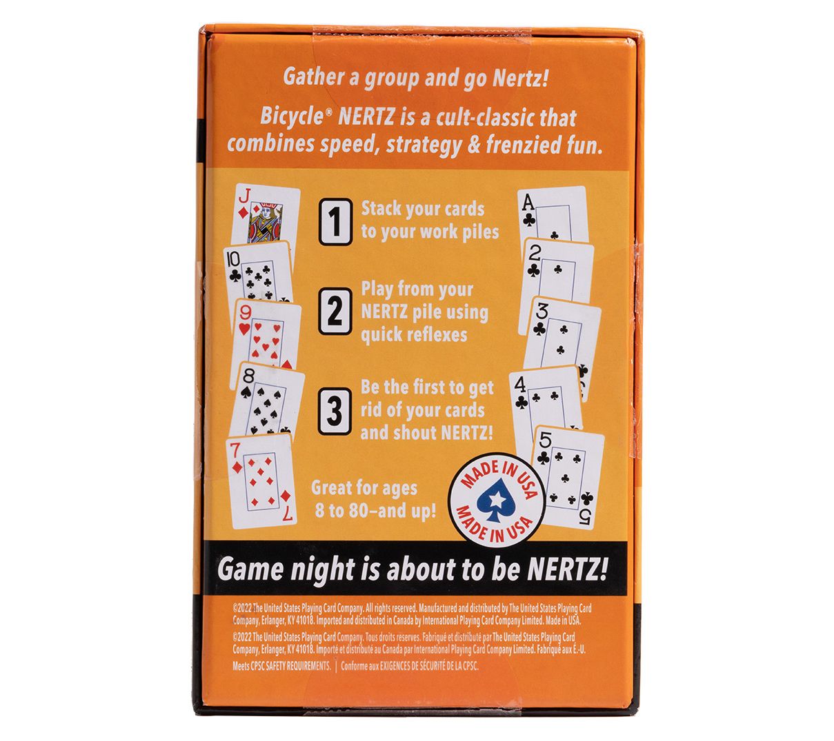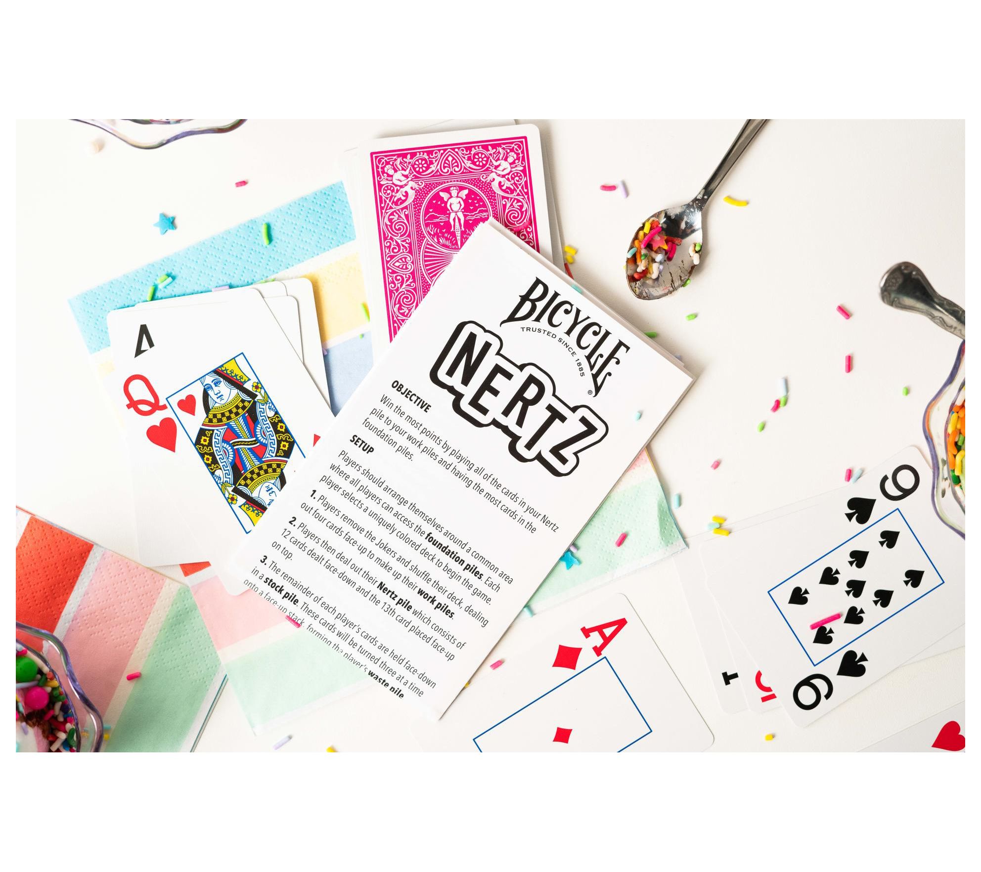 Bring excitement to your next gathering with this fast-paced tabletop card game, where friends and family race to clear their piles and shout Nertz! Eight colorful, jumbo-index decks make it easy for everyone to keep track of their cards, while the smooth shuffling and easy dealing ensure lively play for all ages. From Bicycle.