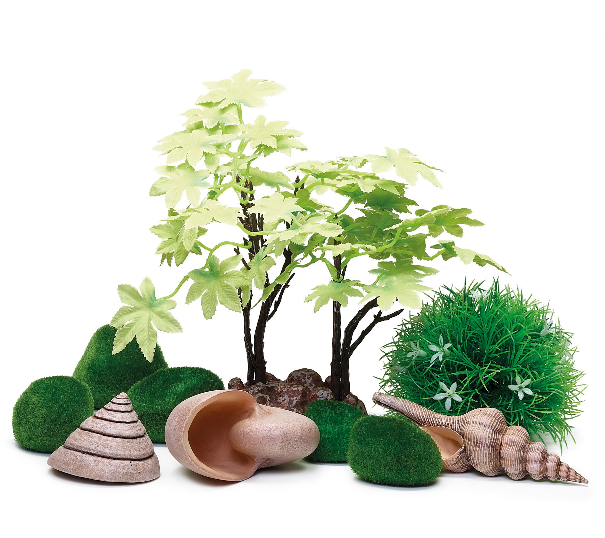 • Kit includes a green maple tree, floral topiary ball, three natural-color seashells, and five moss pebbles