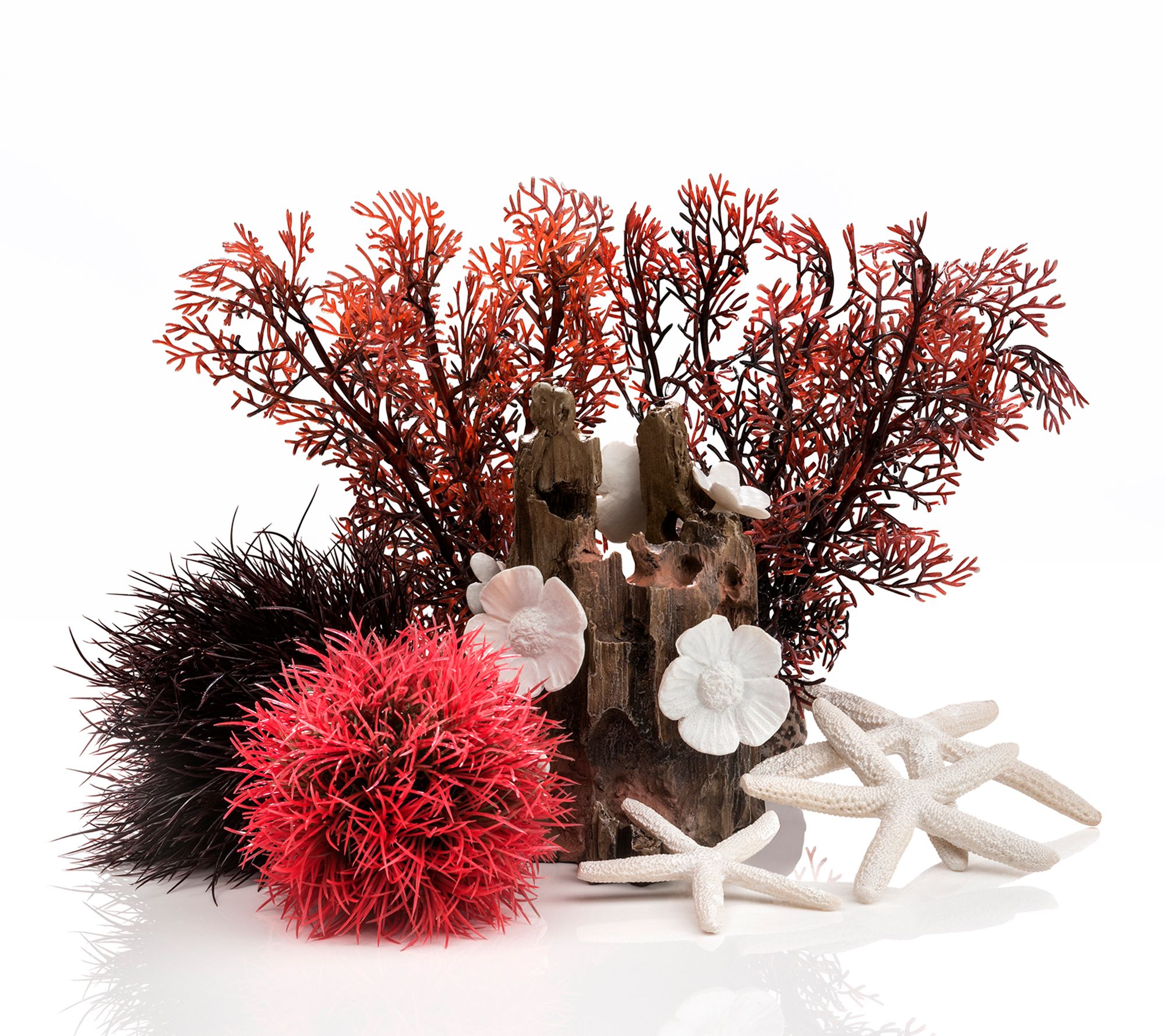 • Includes flower sculpture, two small crimson sea fans, red color ball, crimson sea lily, and three white starfish