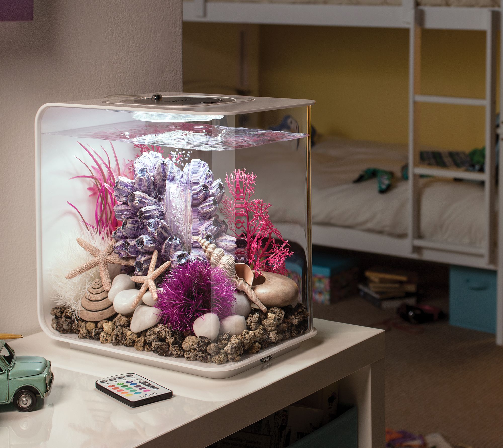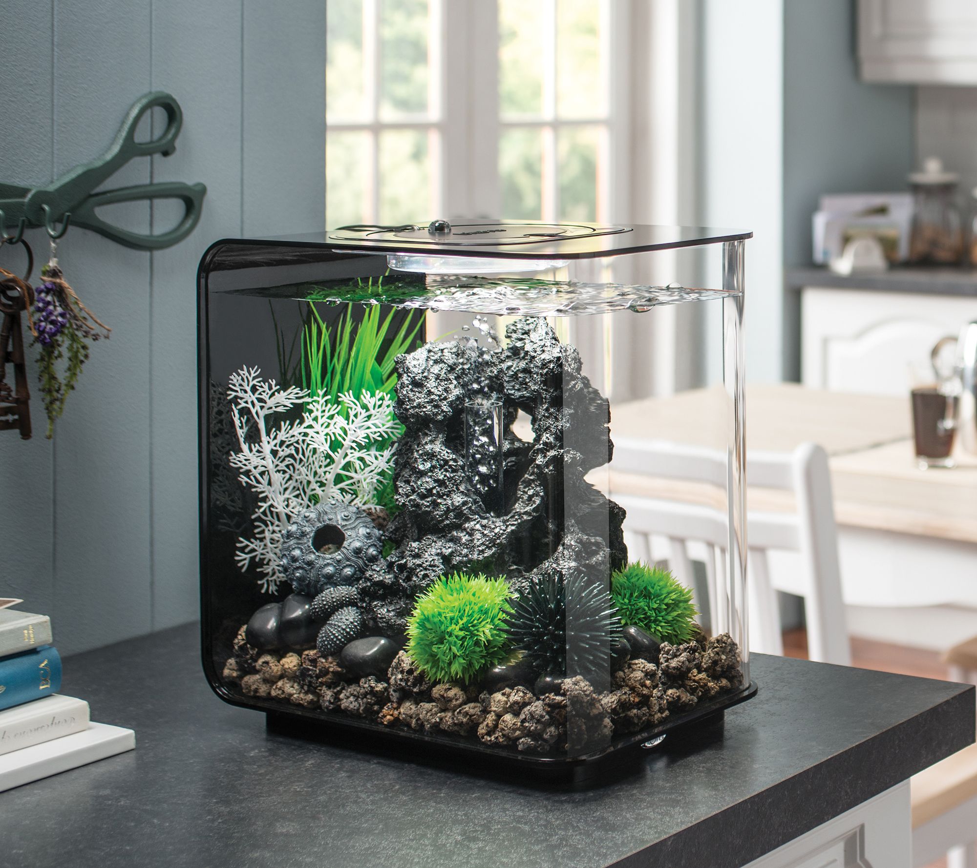 Bring a sense of joy and wonder to your home with the chic and minimalist design of this four-gallon aquarium. Everything you need to start your new hobby is included: an air pump, LED multicolor remote-controlled lighting and remote, filter cartridge, and more. From biOrb.