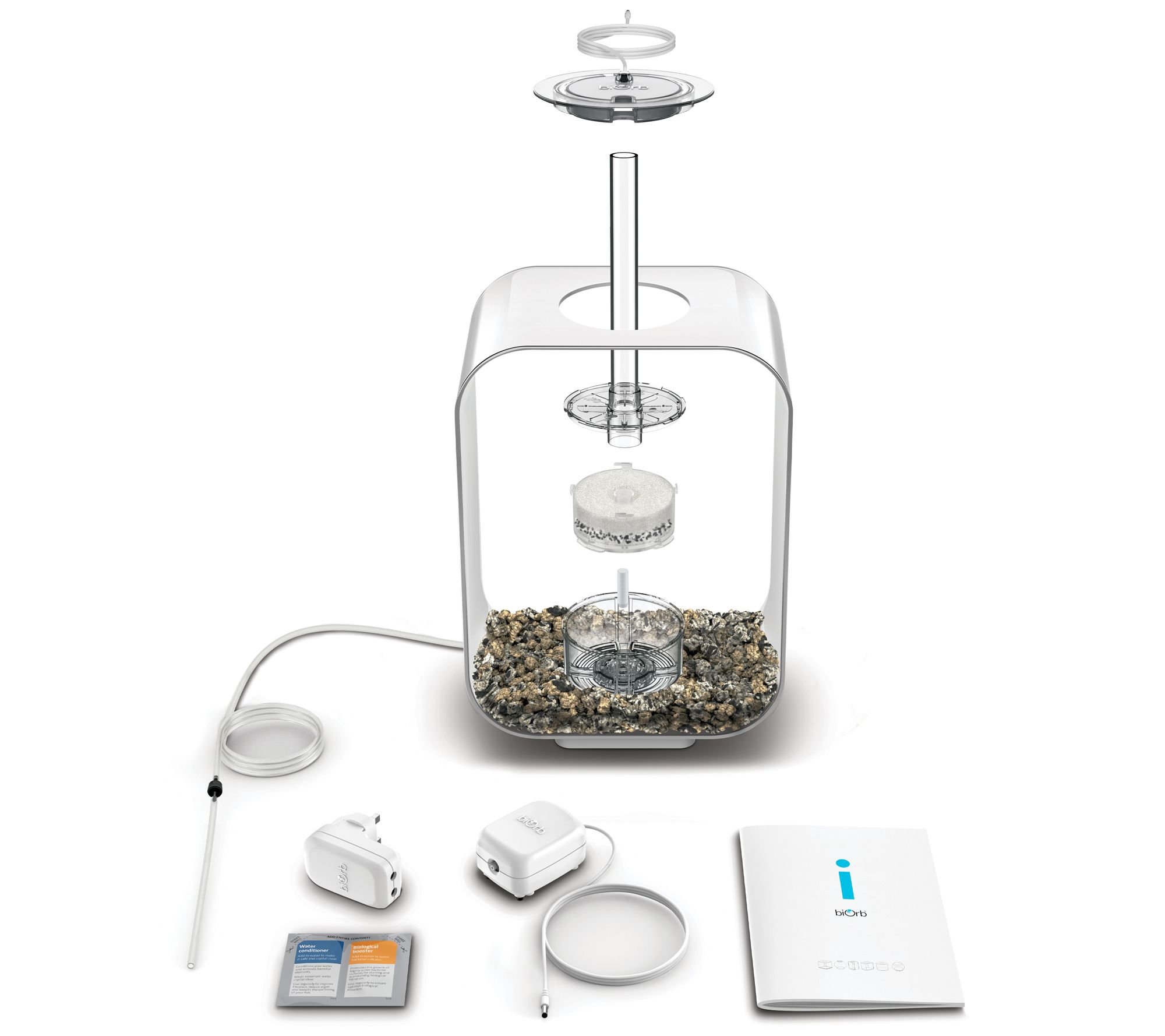 • Includes Life 15 aquarium, air pump, LED lighting and remote, transformer, water treatments, air stone, filter cartridge, ceramic media, two AAA batteries, and manual