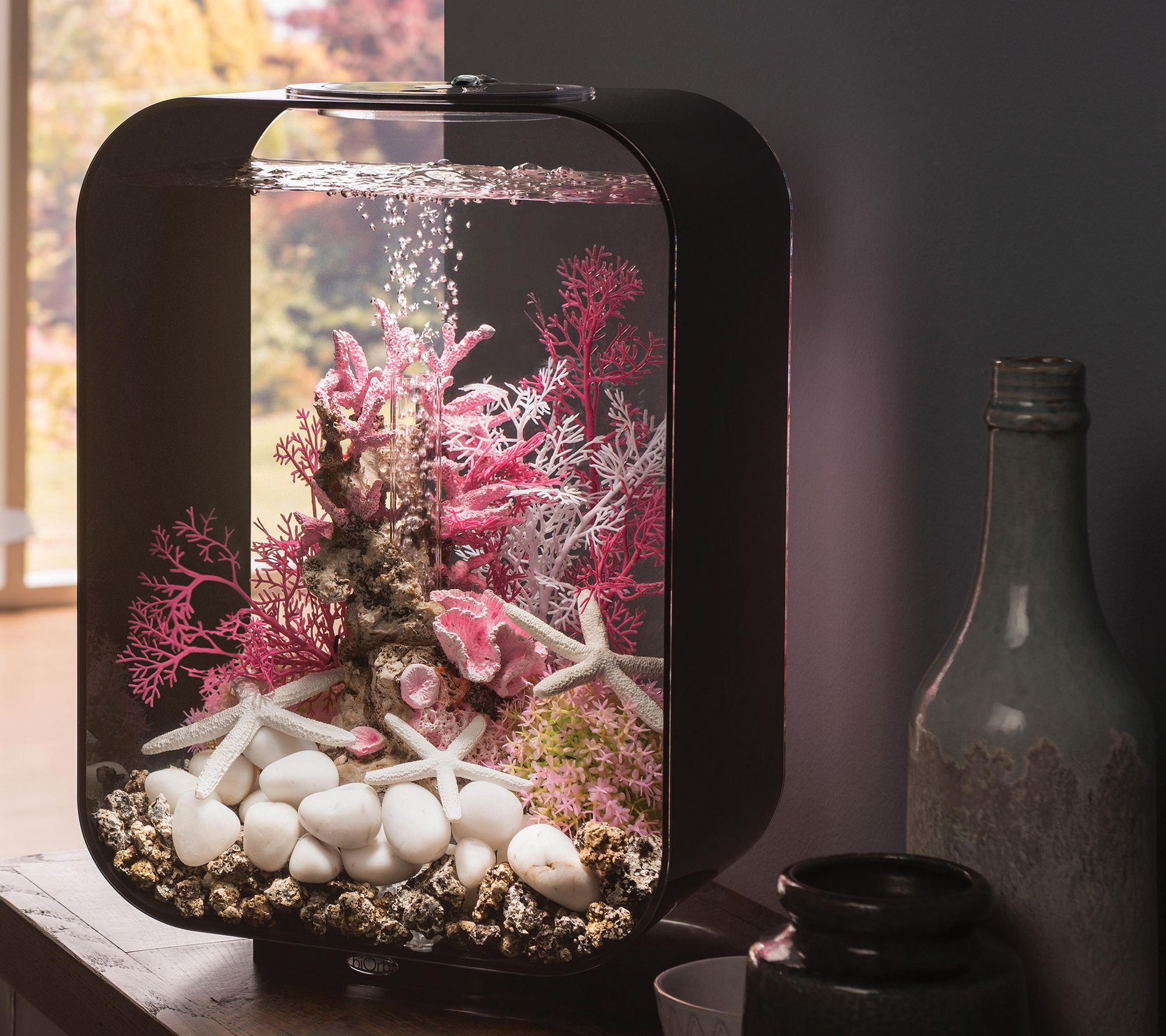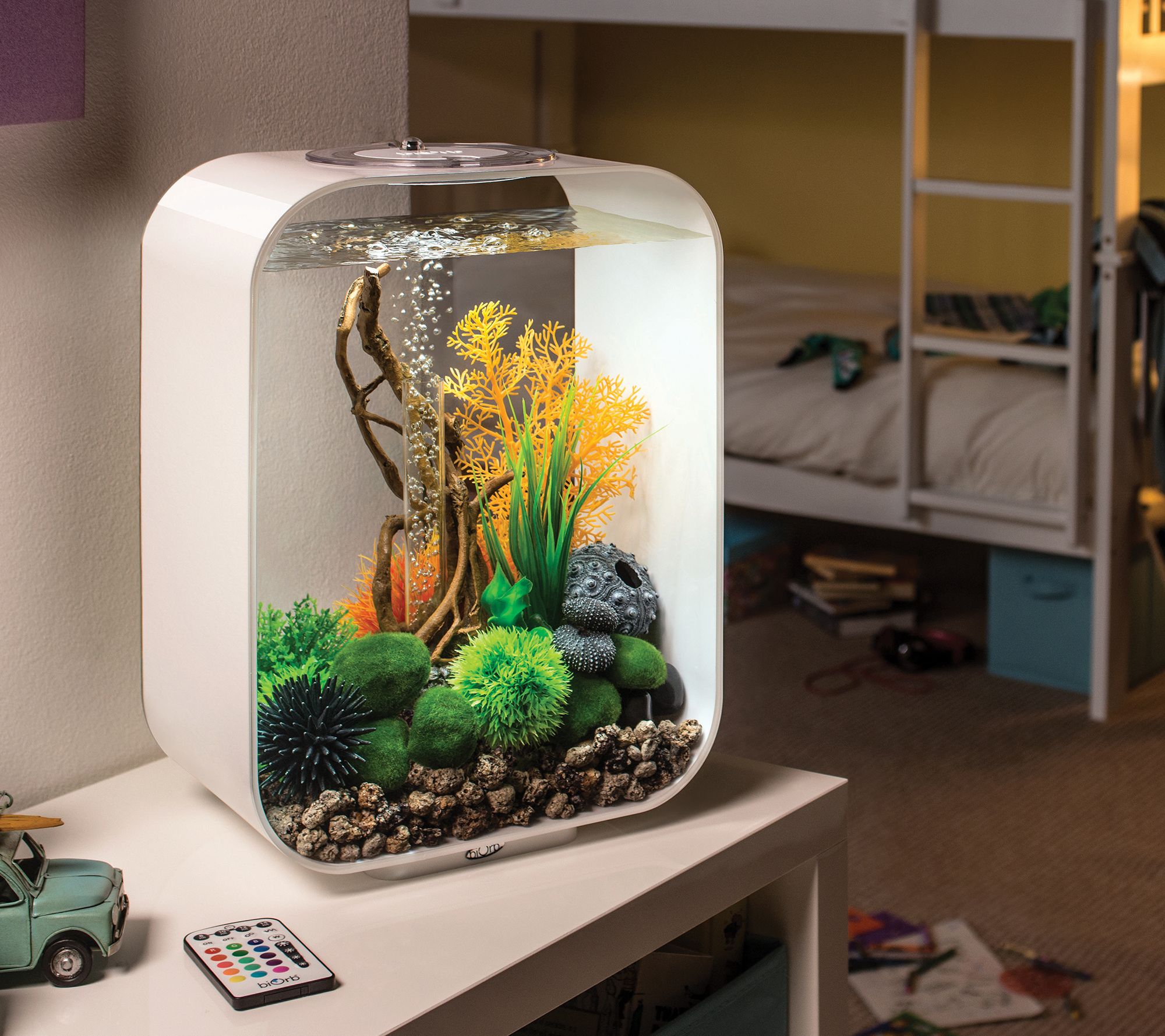 Bring a sense of joy and wonder to your home with the chic and minimalist design of this four-gallon aquarium. Everything you need to start your new hobby is included: an air pump, LED multicolor remote-controlled lighting and remote, filter cartridge, and more. From biOrb.