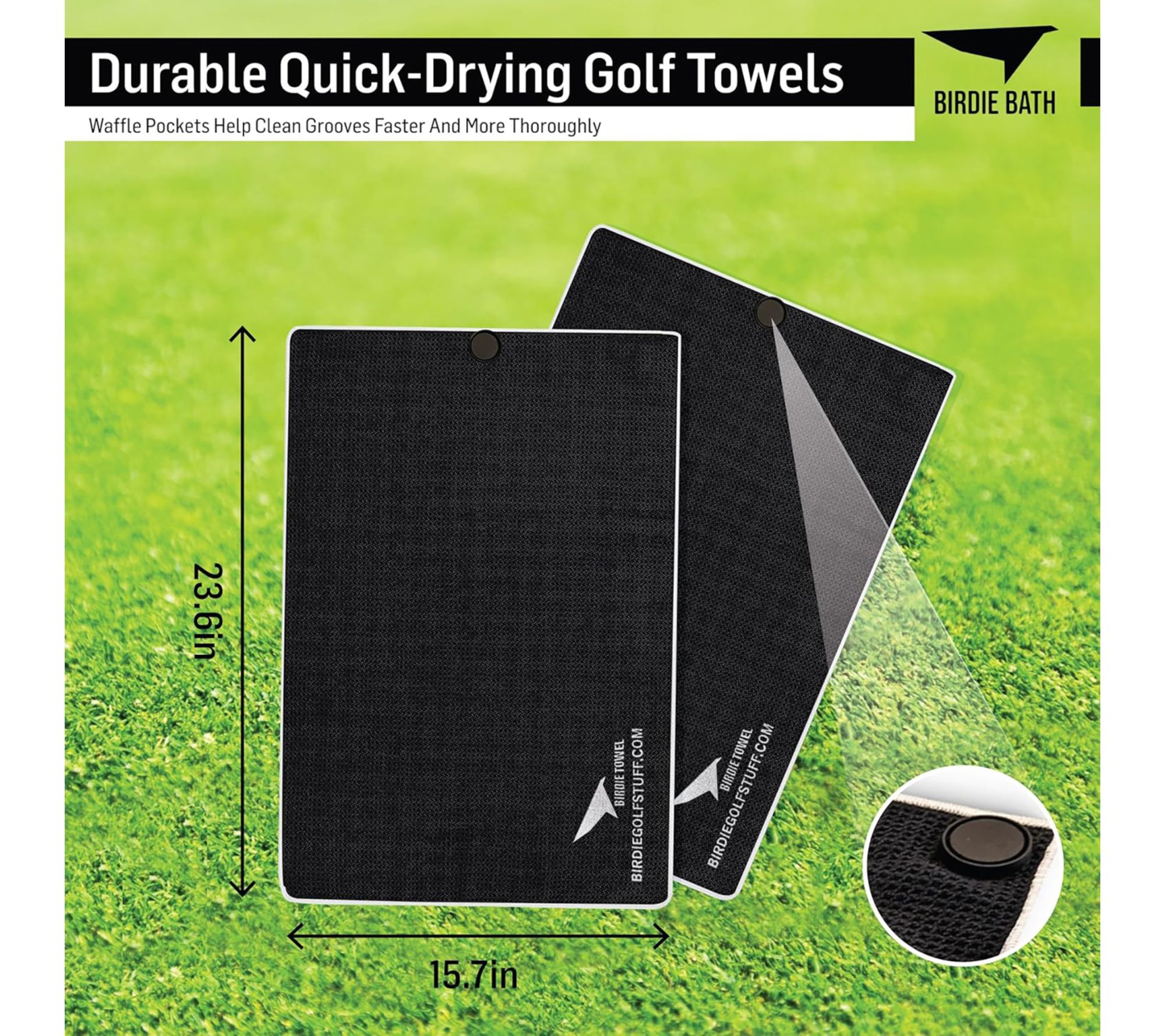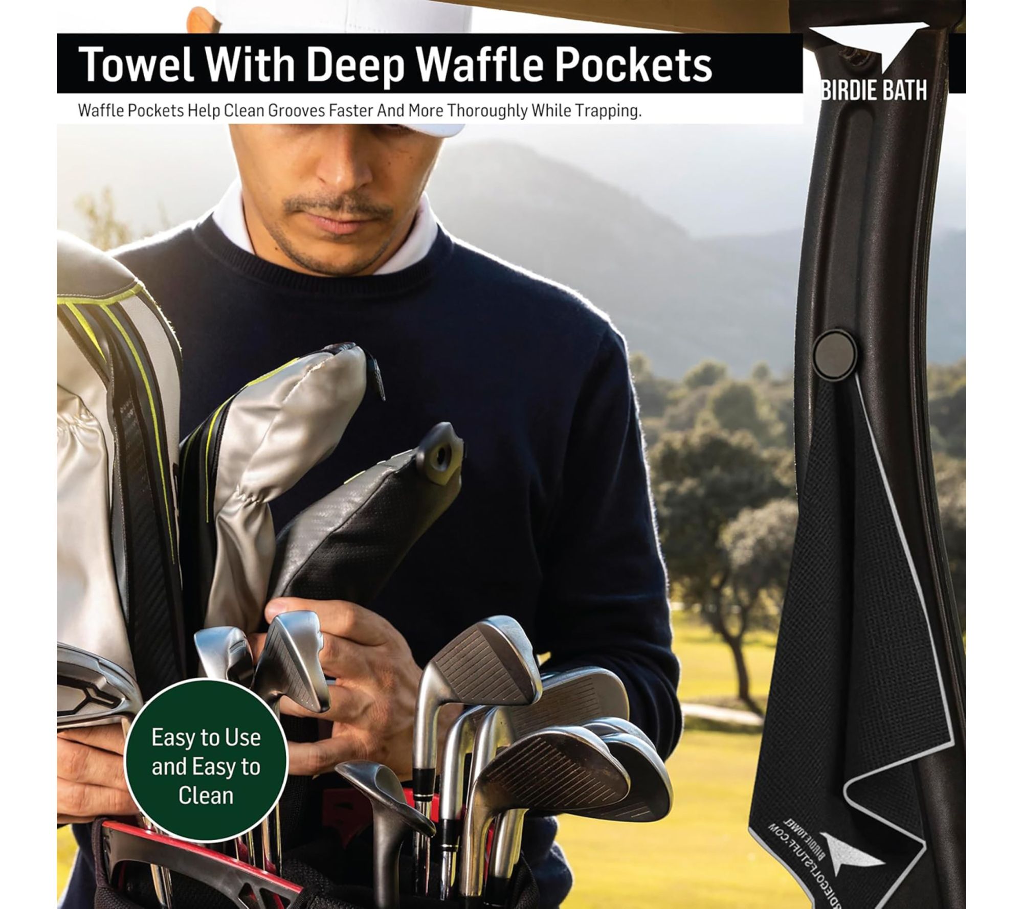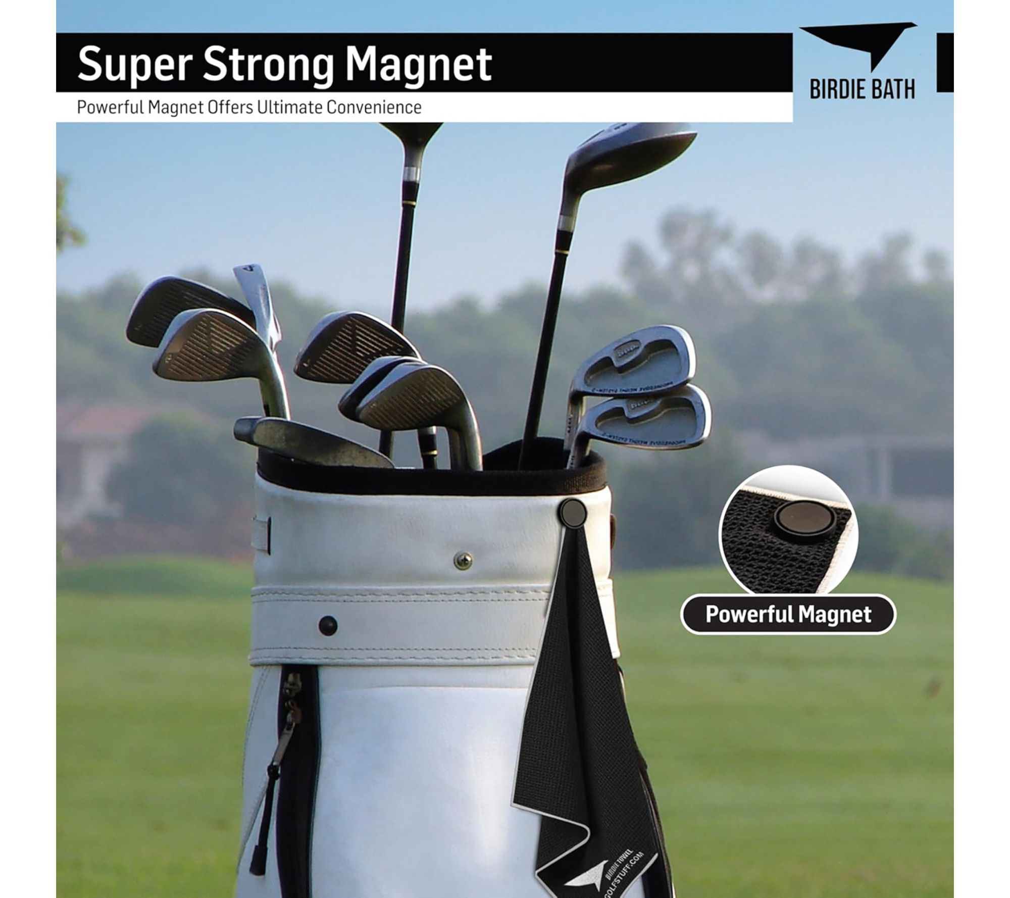 Say goodbye to lost golf towels and hello to convenience with this magnetic golf towel. Its deep waffle pockets are perfect for trapping dirt, grass, and moisture, making club and hand cleaning a breeze. The powerful magnet ensures you always have your towel where you need it, whether on the course, in your garage, or at the gym. From Birdie Golf.