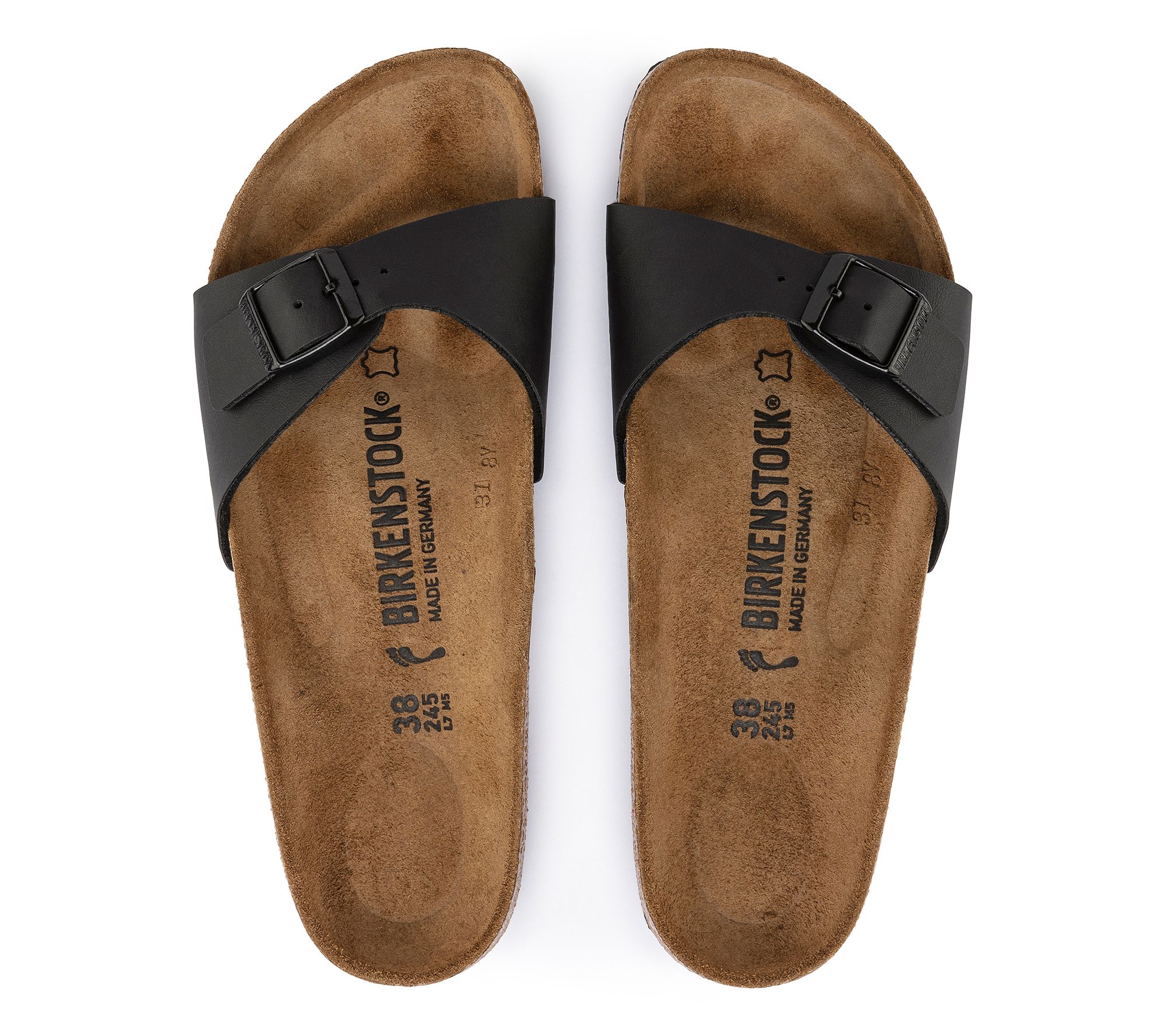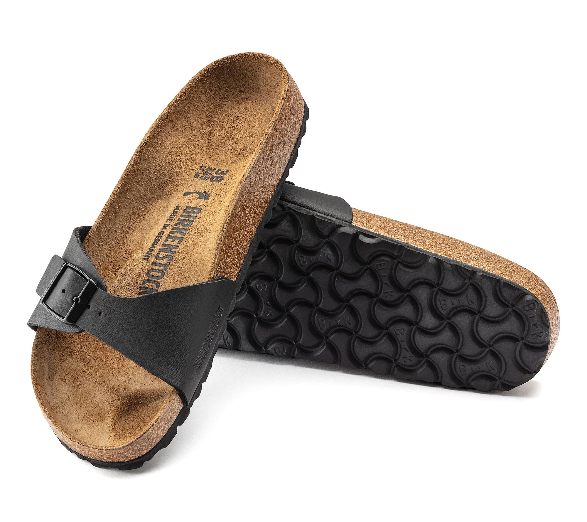 Birkenstock Madrid Birkenstock contoured cork footbed supports the arches of the foot foot and conforms to the foot, with wear, to create a custom fit. The suede footbed lining helps keep you comfortable. Heel Height: Nuetral. Sole thinkness: 1/3 in Made in Germany. Fit True to Size. Synthetic Upper, Leather Lining, EVA outsole Footbed is not removable