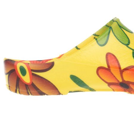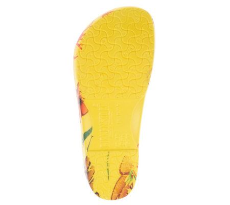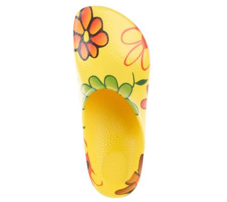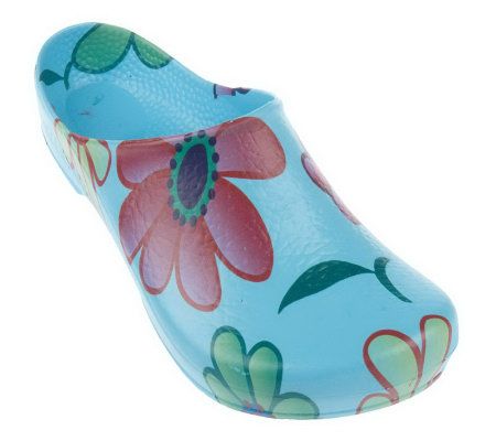 Slip on and go. These classic outdoor clogs are perfect for warm-weather days. You'll love the comfort and the durability offered by the padded insole and textured outsole, and your inner fashionista will adore the funky floral design. From Birki's.