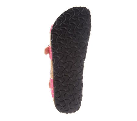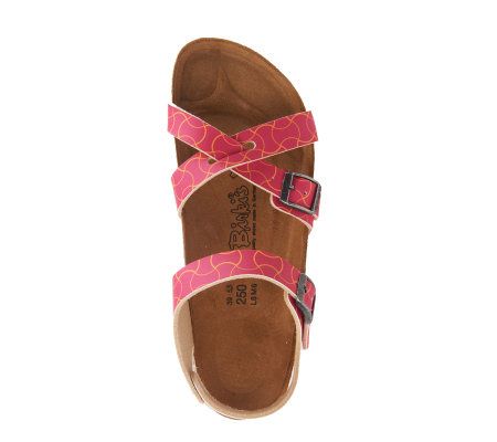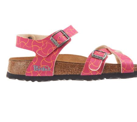 As comfy as they are cute, these pretty printed sandals feature a cross-band design and adjustable buckles for a perfect fit. The conforming footbed pampers your feet with arch support, a deep heel cup, and a toe bar. From Birki's.