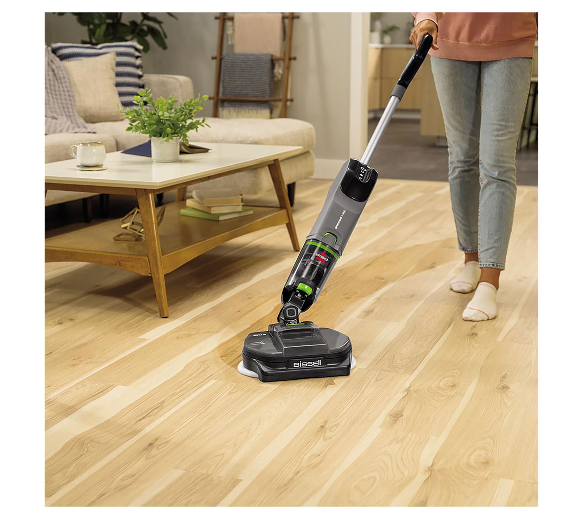 Is vacuuming or mopping alone not cutting it? Say goodbye to those multifaceted hard floor messes and hello to your new cleaning BFF -- the BISSELL SpinWave + Vac All in One Spin Mop and Vacuum. With spinning pads that scrub, mop, and vacuum debris all at once, this multitasker glides across sealed hardwood, tile, linoleum, laminate, and vinyl floors. Whether you're tackling post-dinner kitchen chaos or chasing down muddy footprints, enjoy up to 70 minutes of mop time or up to 20 minutes in vacuum + mop mode. Plus, the included Hard Floor Sanitize Formula wipes out 99.9% of bacteria, so your floors are left sparkling -- and ready once again for guests, pets, and grateful family members. From BISSELL.