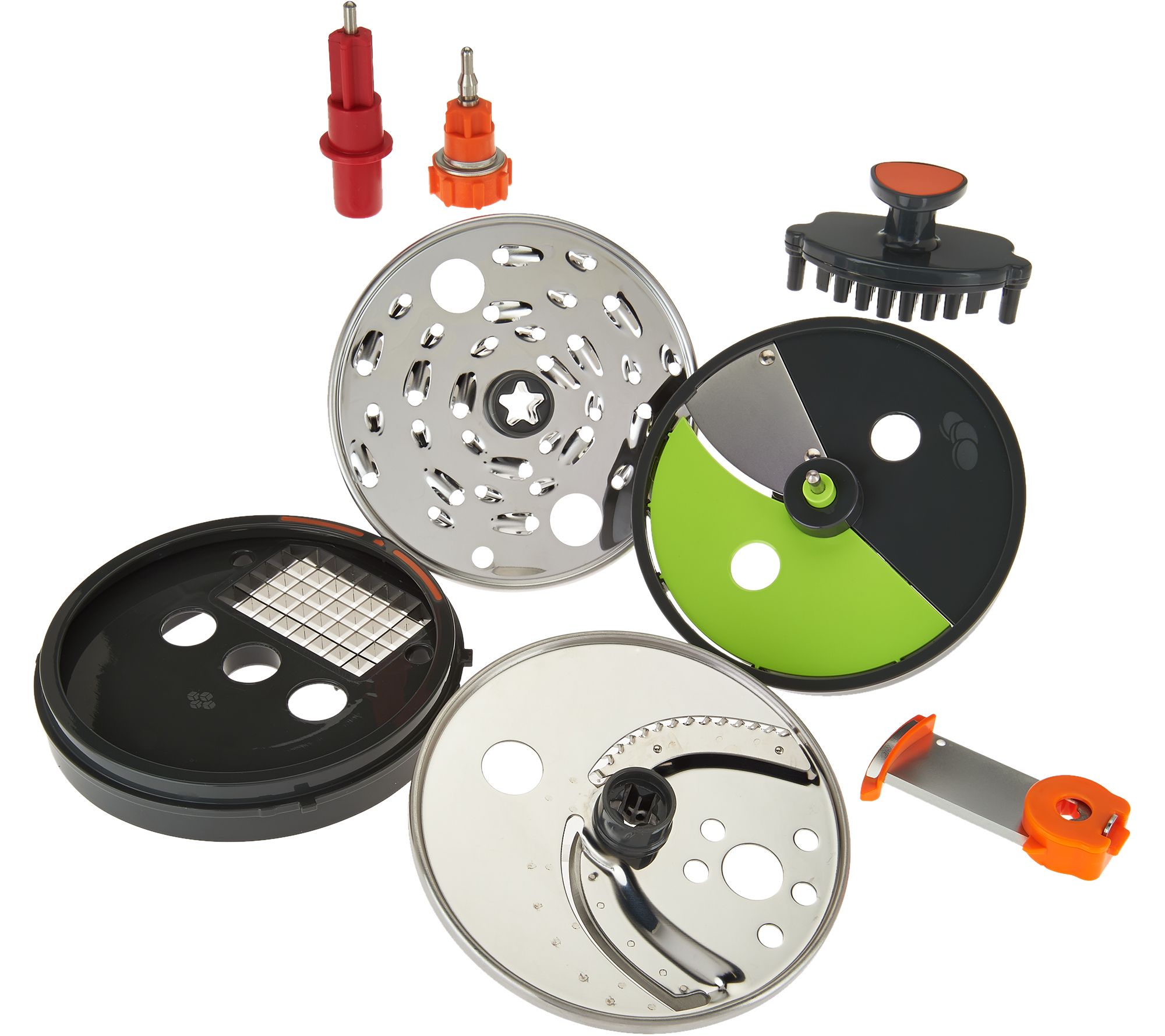 • Includes food processor, dicing disc, slicing disc, dual-sided shredding/grating disc, dual-sided julienne disc, and storage case