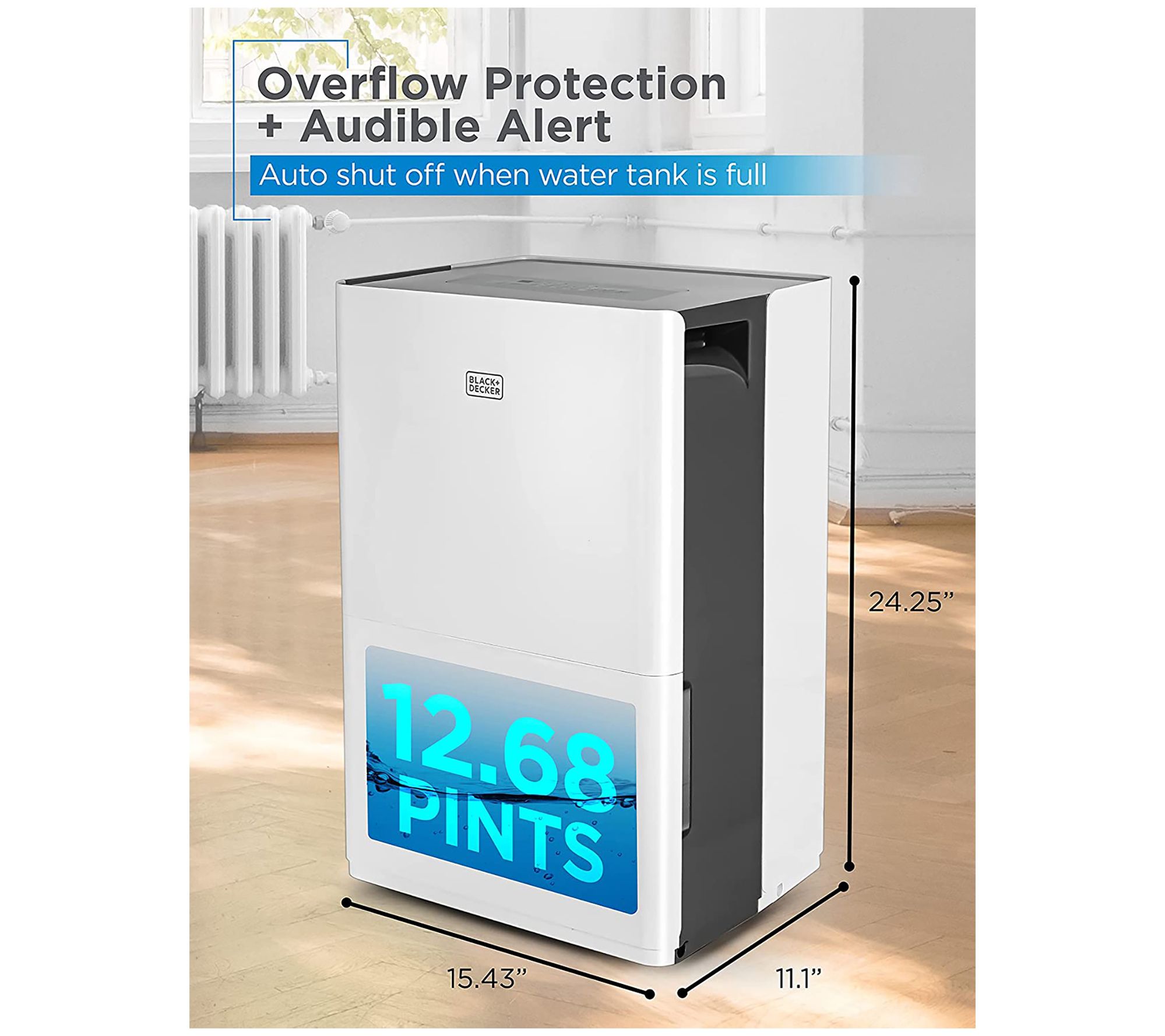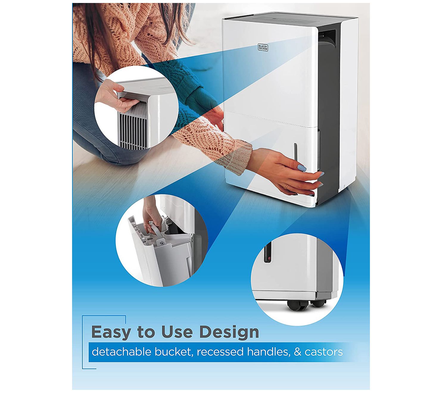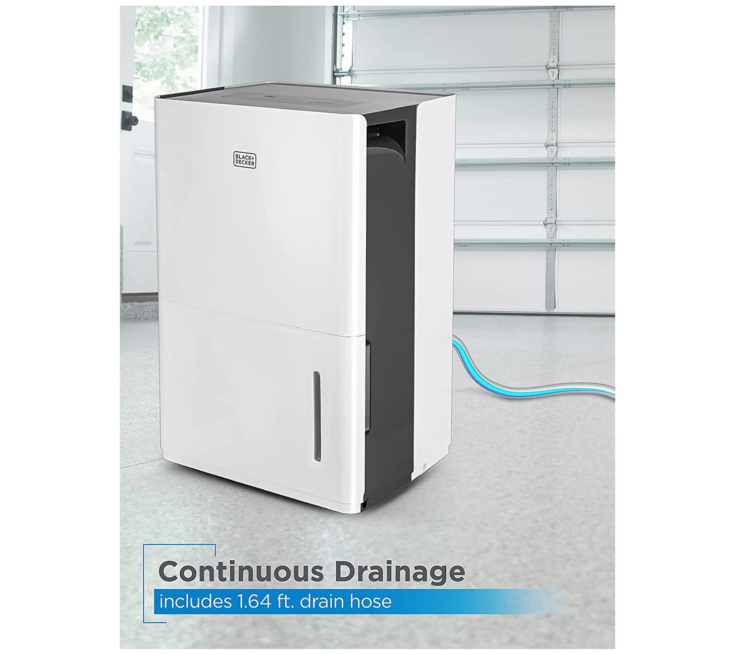 Manage moisture levels while adding a breath of fresh air to your indoor spaces with this portable 50-pint dehumidifier, featuring casters for easy rolling, a convenient water-level indicator light, a 12.68-pint reservoir for collection, and the ability to use a hose for continuous drainage. From BLACK + DECKER.