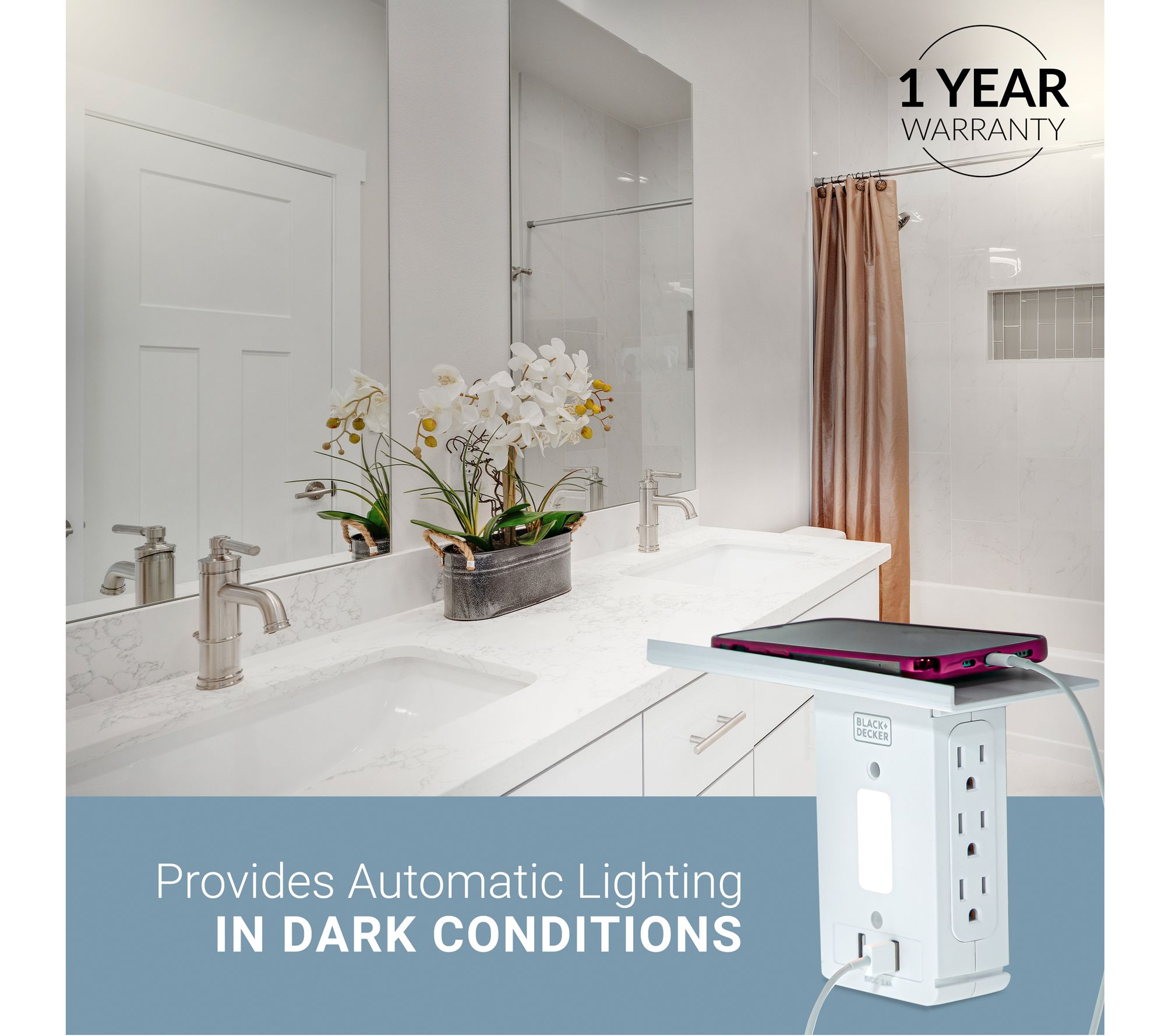 Add amazing 4-in-1 functionality to your home with this wall surge protector complete with night light with sensors, USB charging ports, and extra outlets (plus a built-in shelf for smaller items such as a smartphone, toothbrush, or toiletries). From BLACK + DECKER.