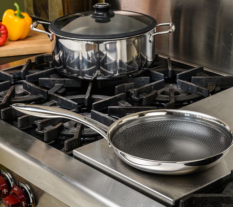 Flip, fry, and sear all your favorites with this versatile 9.5" fry pan, featuring a textured surface and durable stainless steel construction that cleans like nonstick. From Black Cube.