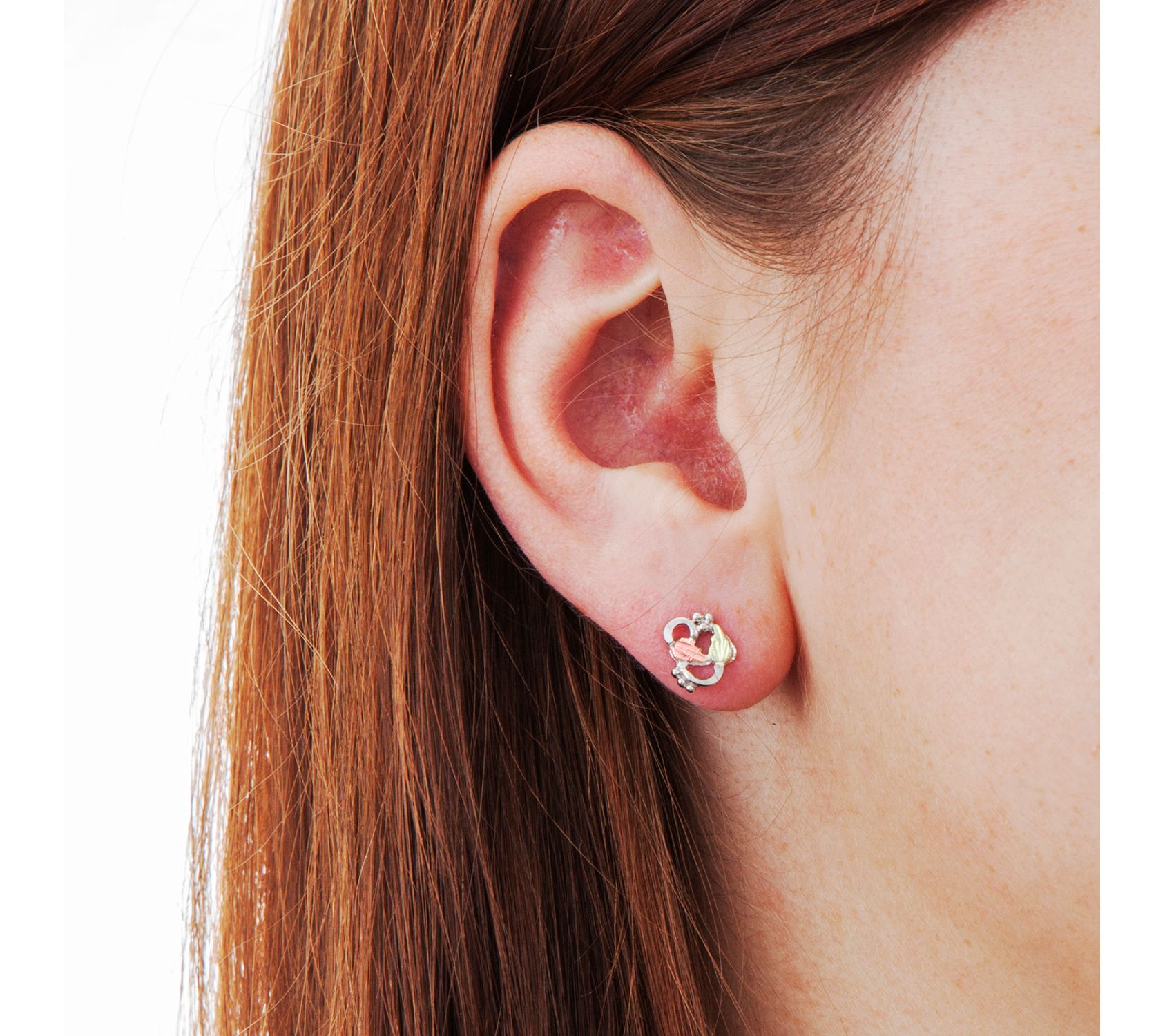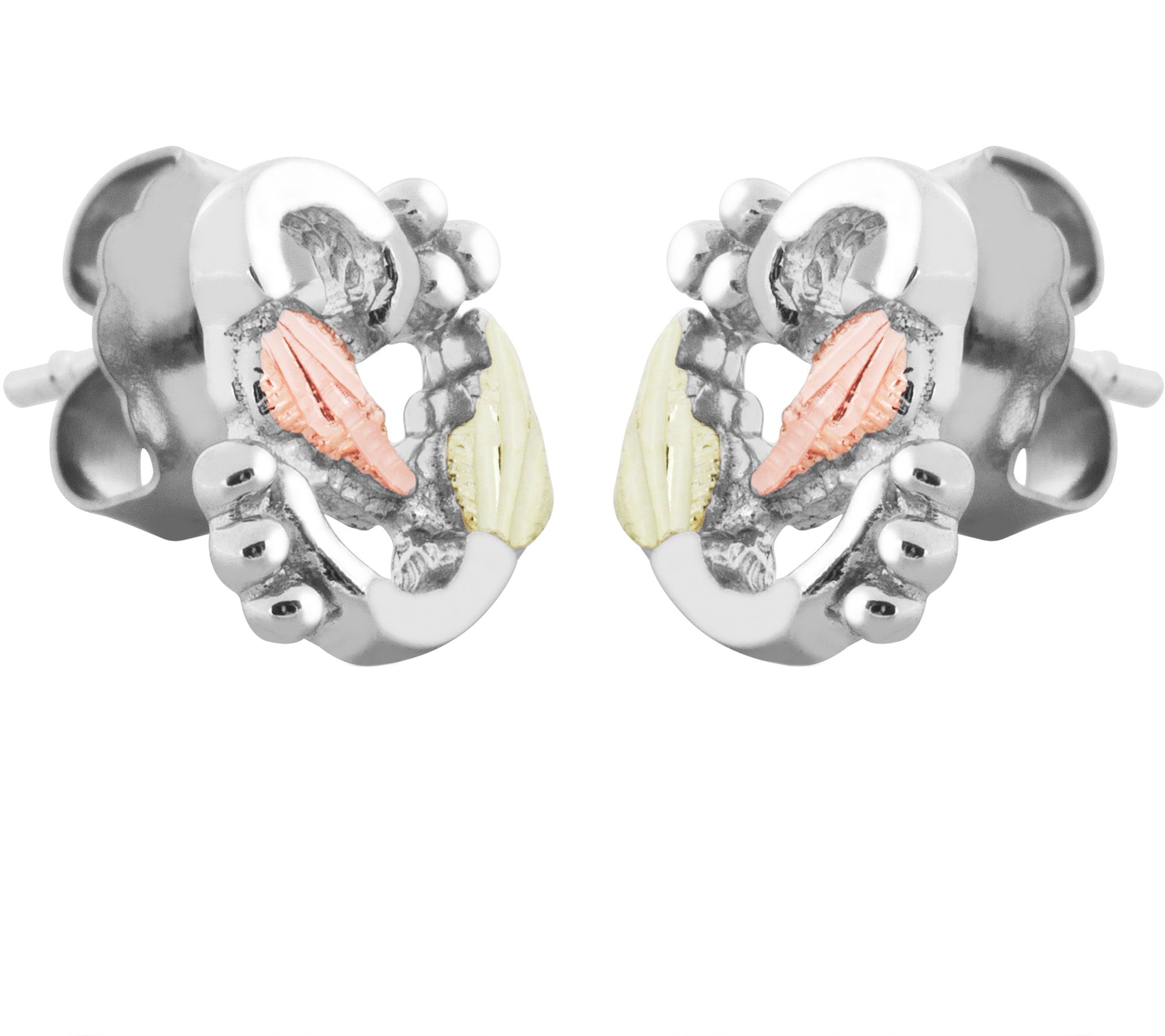 Indulge in the beauty of these elegant earrings. The sterling silver design is decorated with 12K rose and green gold leaves. From Black Hills Gold.