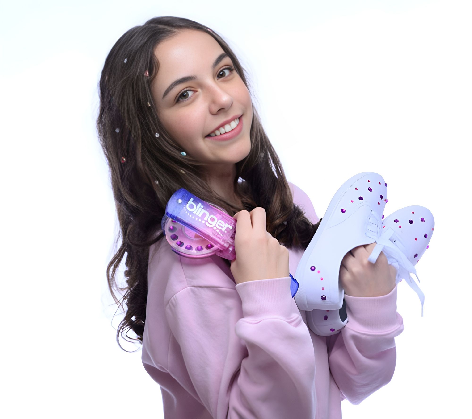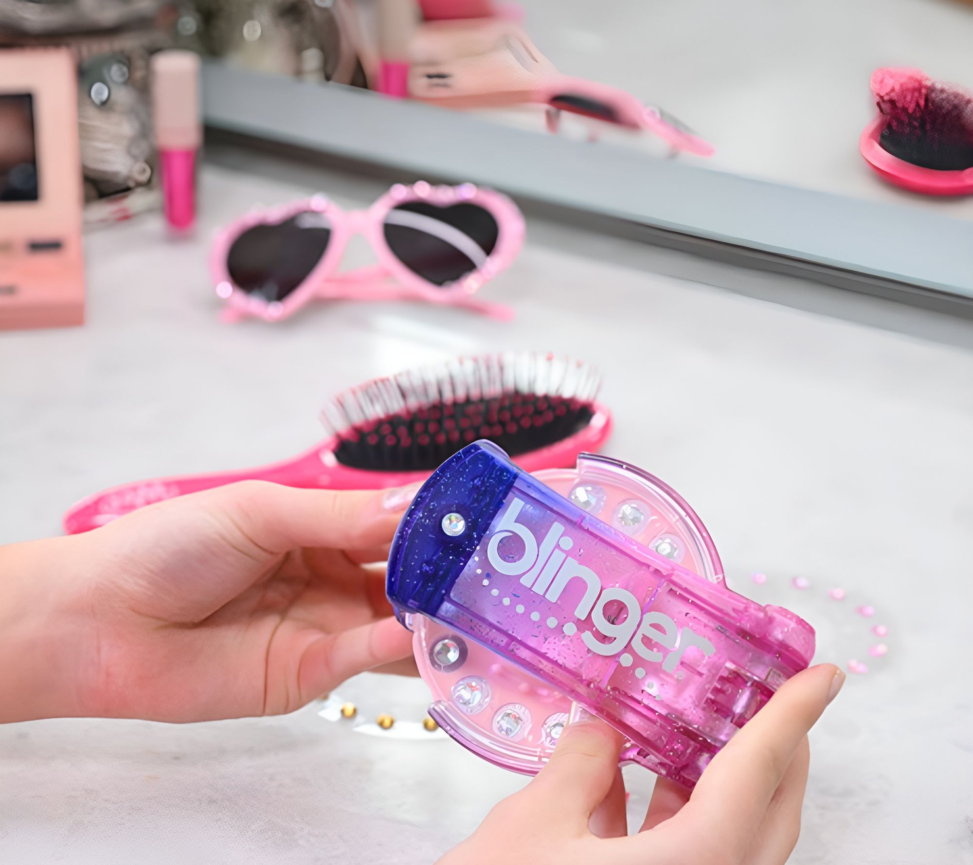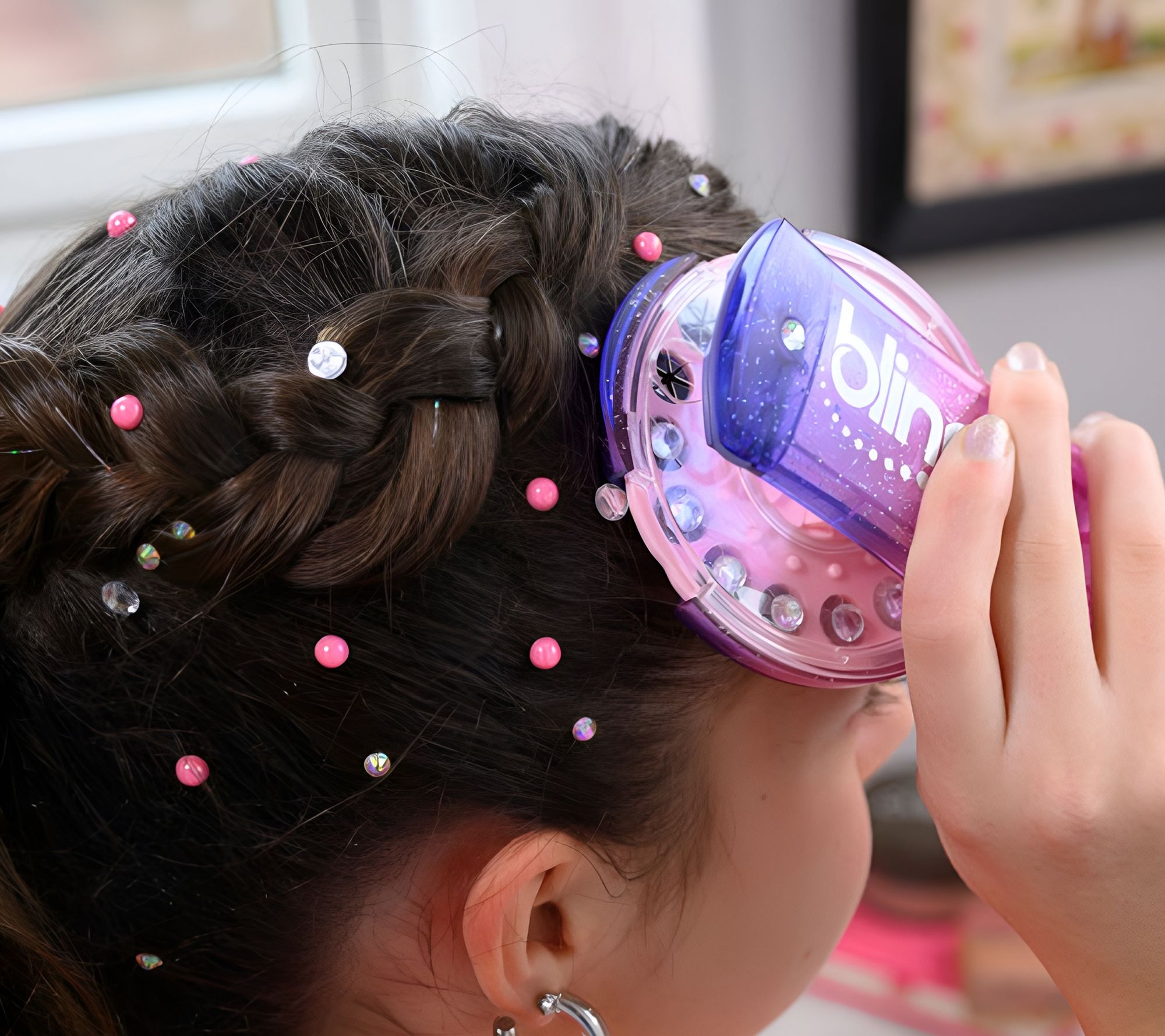 Bling it on! Go from glum to glam with this gem stamper styling tool that fancies up everything from hair to accessories. Adhesive-backed gem-like stones instantly elevate looks with a splash of sparkle. Simply us the gem stamper to add bling to your hair, then brush out when you're done. Use it on fashion and accessories, too. So much fun for the young fashionista! From Blinger.