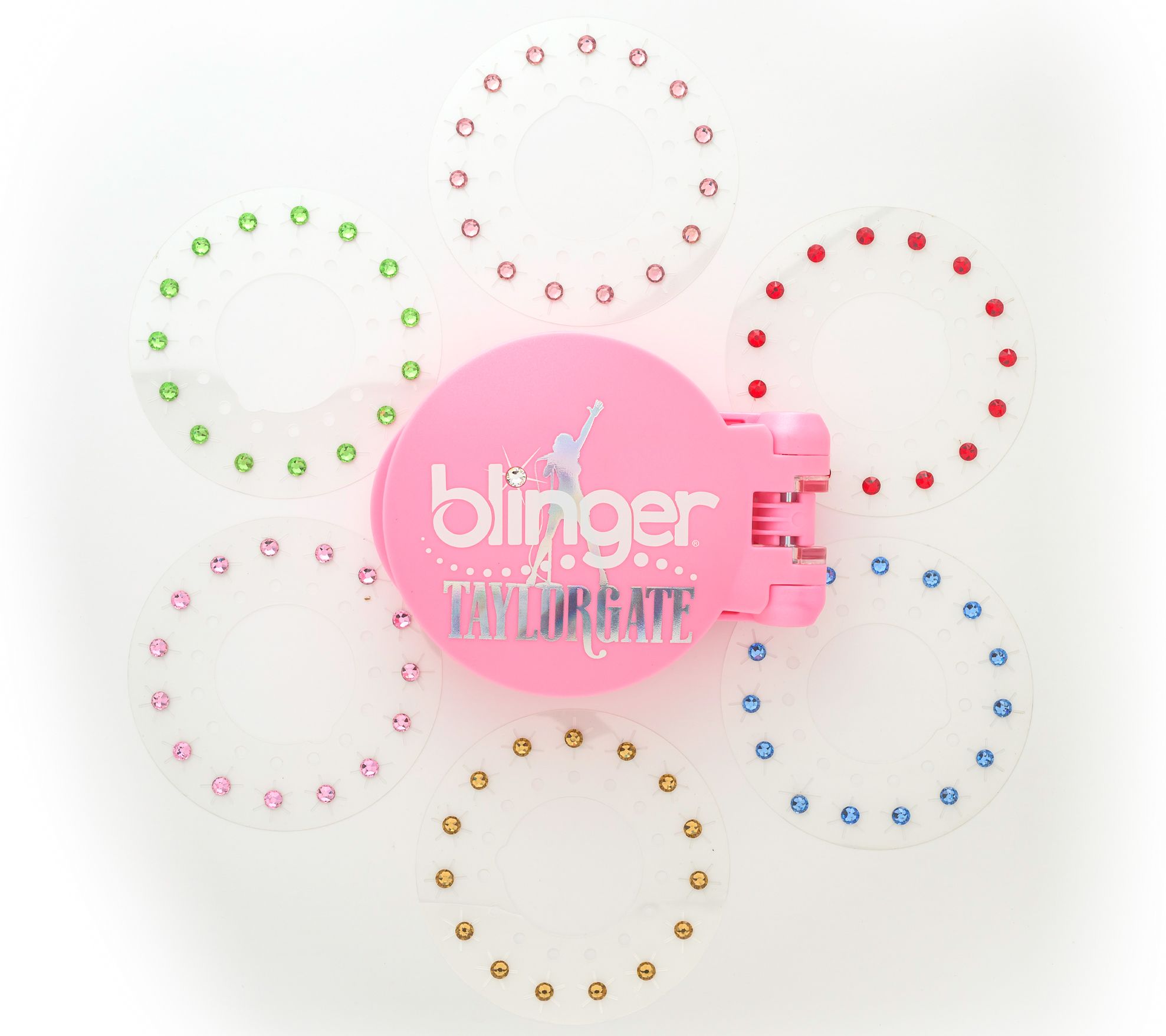 How do I use it: To load the crystals, first open the loading area of the blinger Styling Tool by pushing down on the lip while pulling up on the top of the blinger tool. Place one blinger crystal disc, with crystals facing up, onto the pegs on the carousel. When properly aligned, your crystals will be in the center of each hole on the carousel. Press the clear cover down to close, snapping it shut.