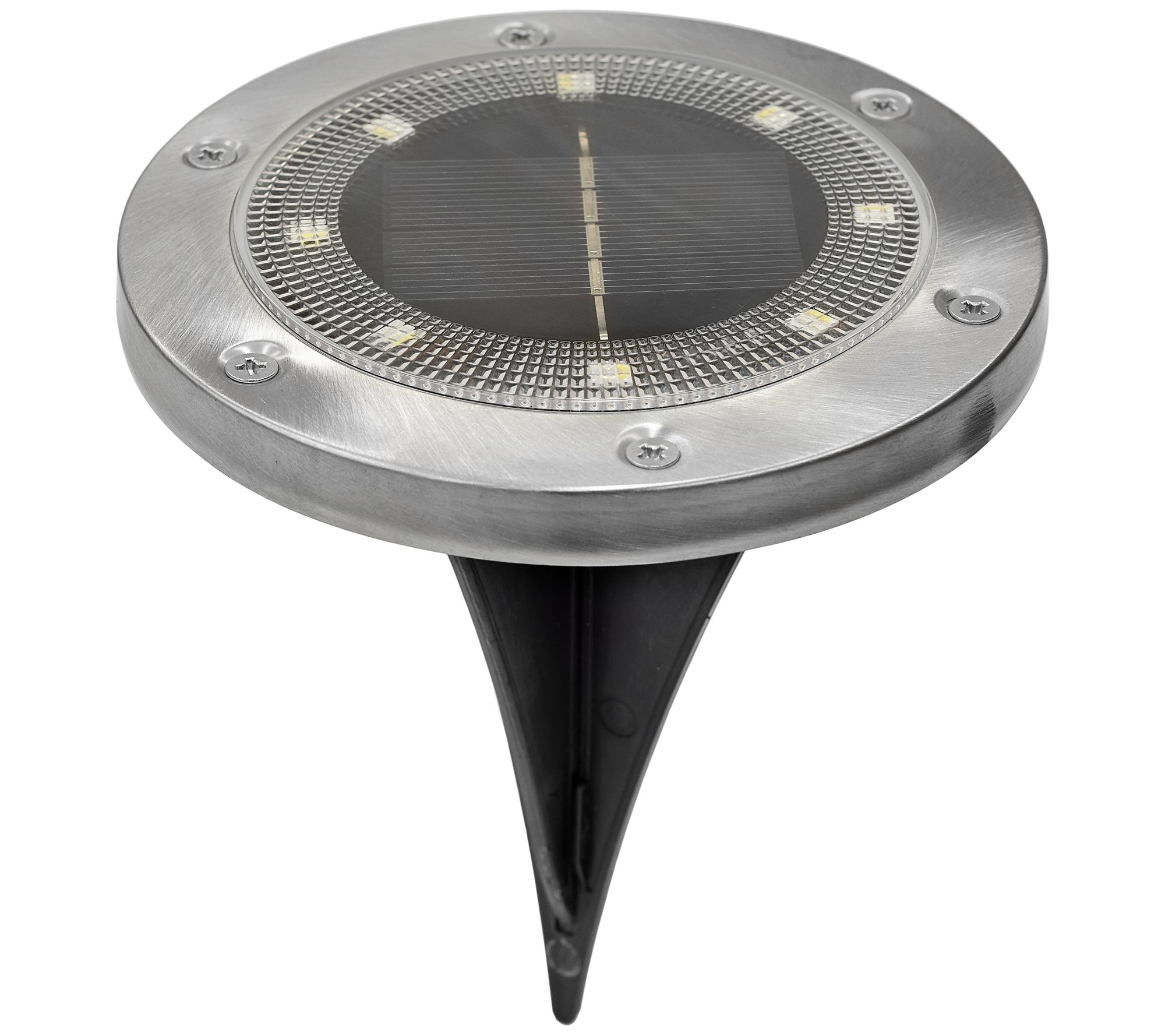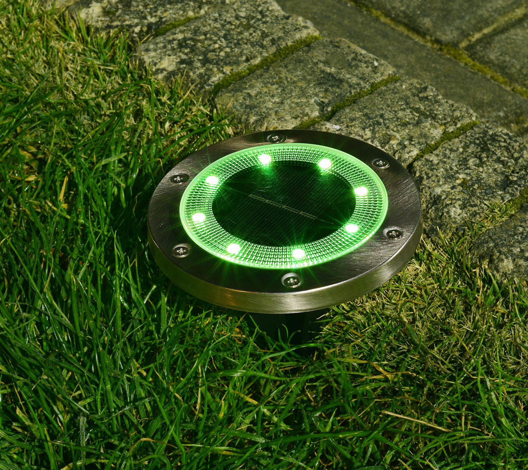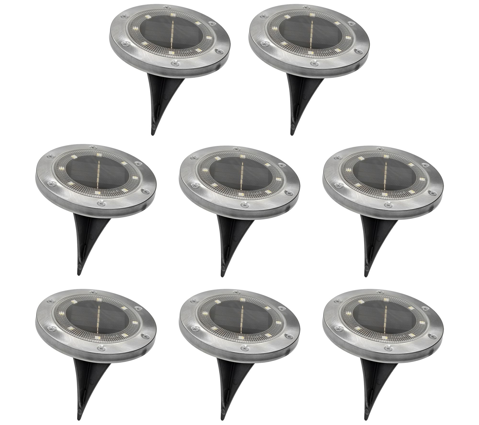 • Includes eight solar-powered LED disc lights with Ni-MH rechargeable batteries, eight removable stakes, and remote