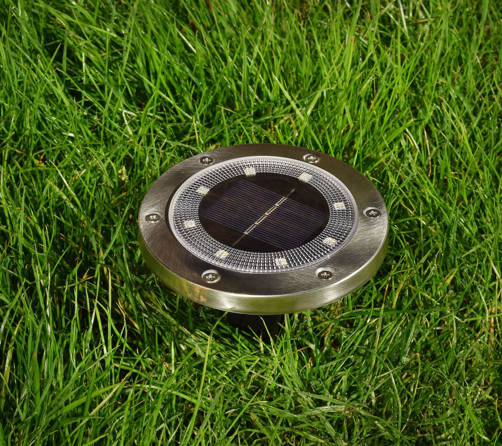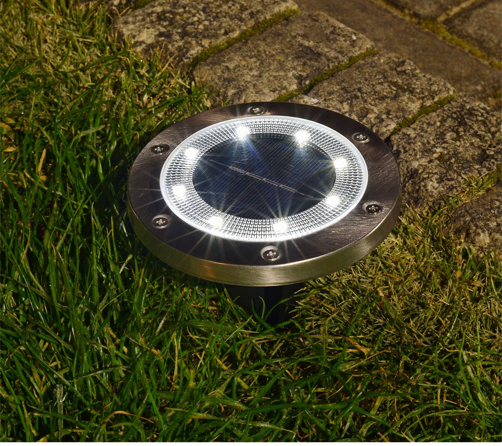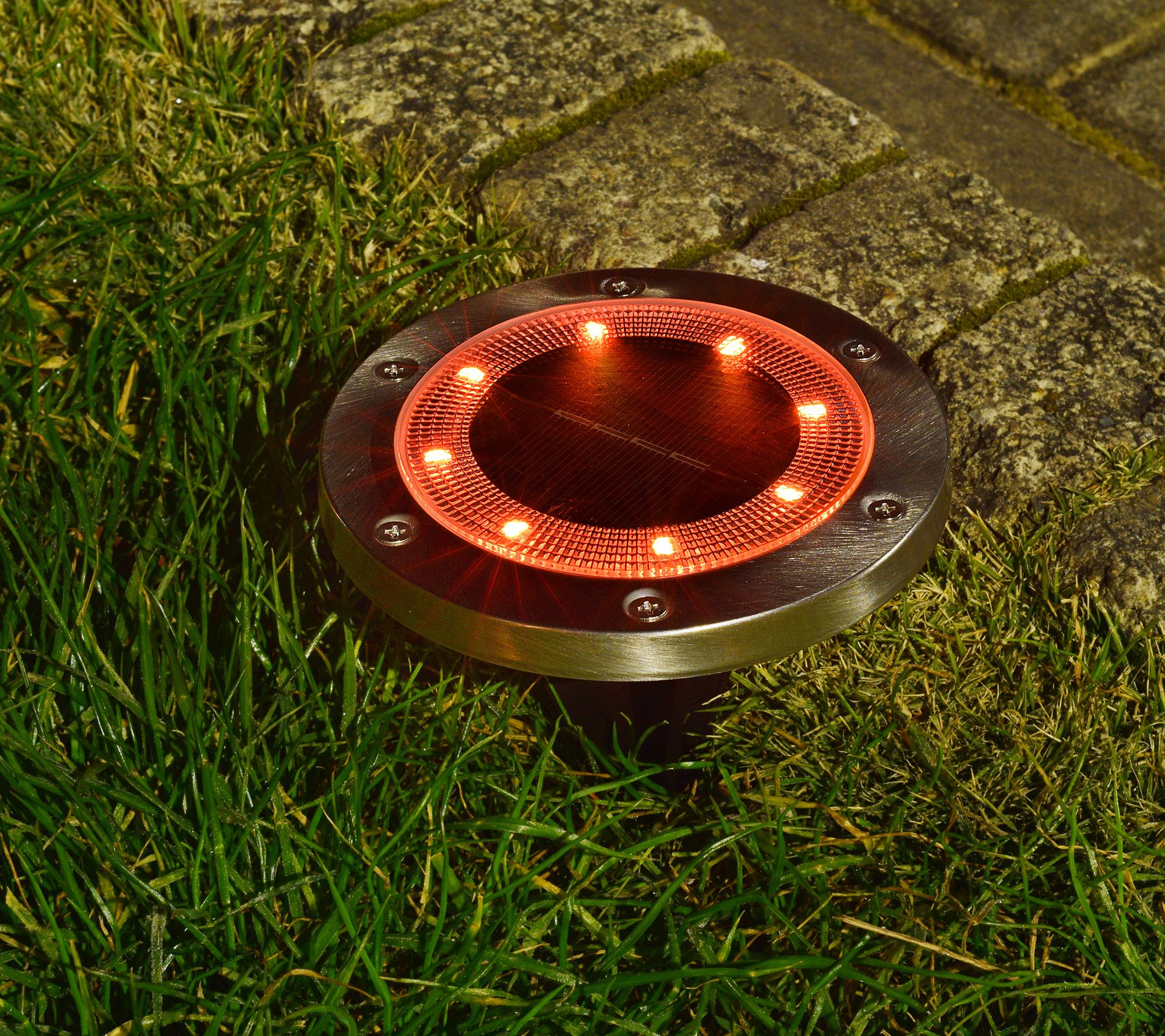 • Includes eight solar-powered LED disc lights with Ni-MH rechargeable batteries, eight removable stakes, and remote