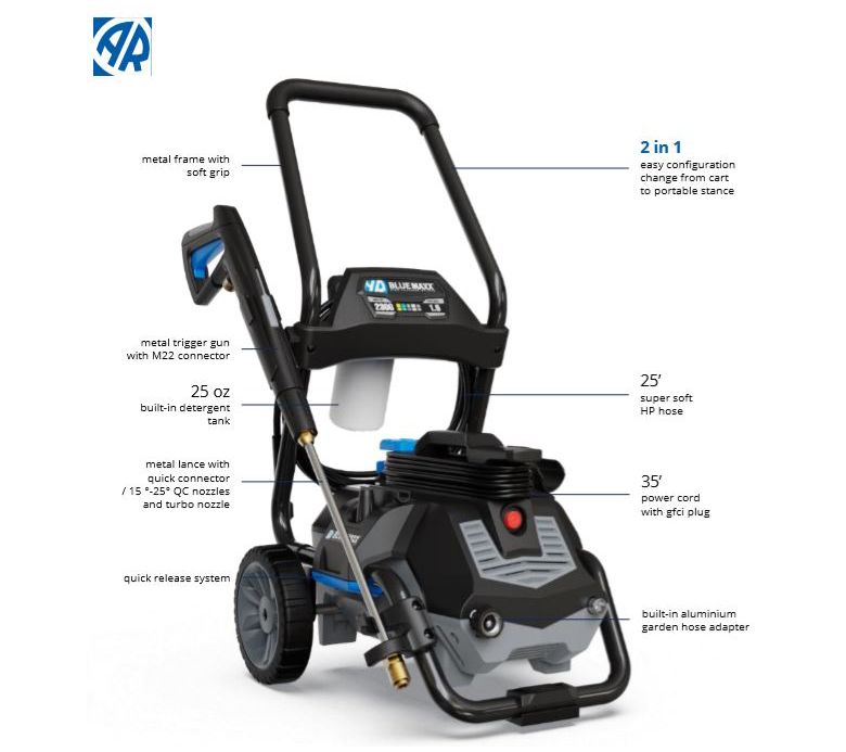 • Includes pressure washer, cart, trigger gun, lance, hose, 15 degree nozzle, 25 degree nozzle, turbo nozzle, foam canon, garden adapter, and o-ring kit