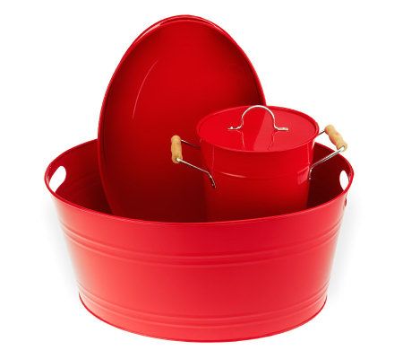 Invite your friends over to enjoy the refreshing beverages you'll serve with this three-piece, enamel-coated galvanized steel party set. Done in your choice of bright colors, the set is perfect for outdoor entertaining. From Blue Jean Chef.