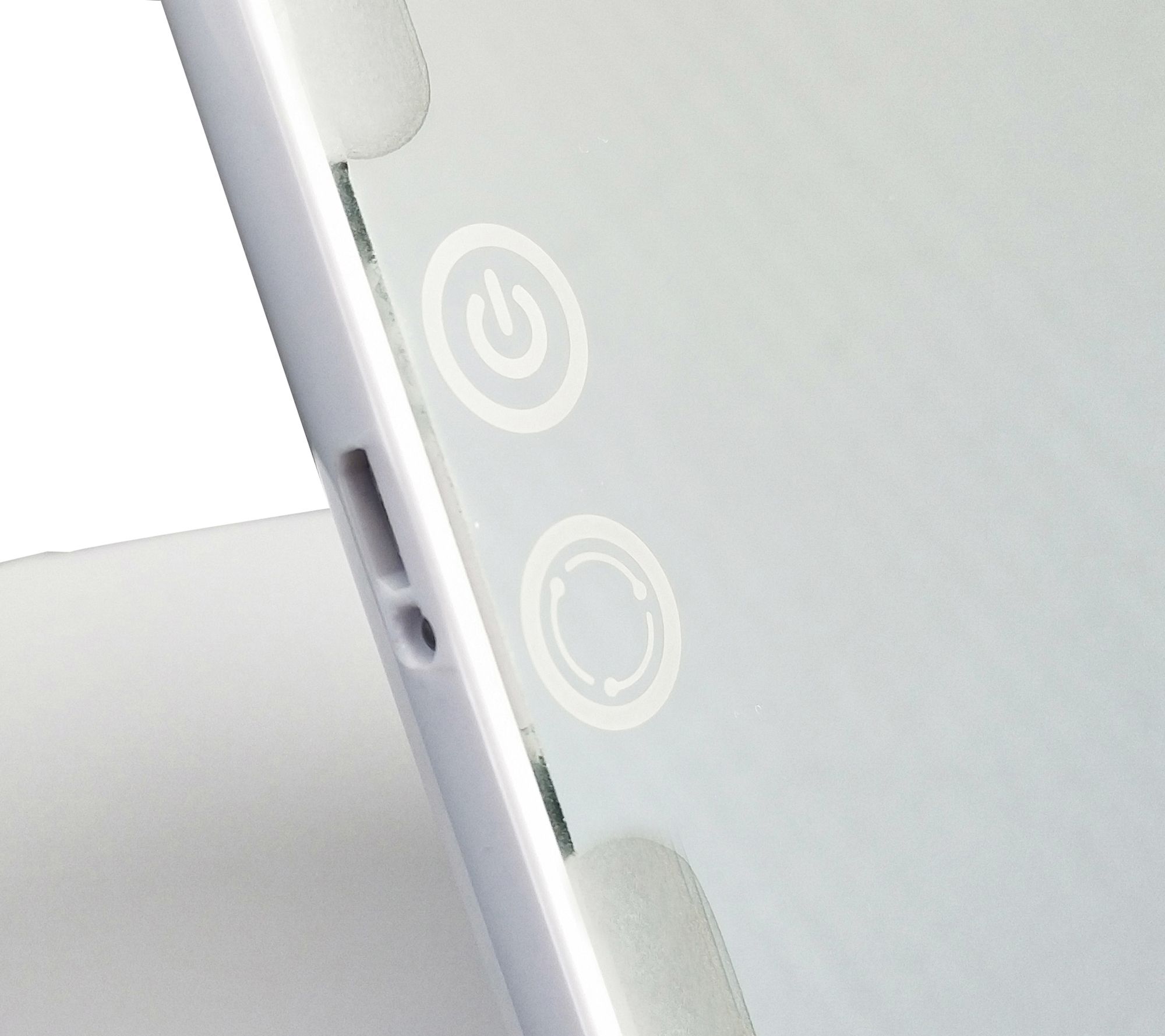 Get a clear view in any light. Super-slim and super-convenient, this folding mirror features a halo of dimmable LED lights along with three different light settings. A rechargeable battery means cordless on-the-go convenience. From Blushly.