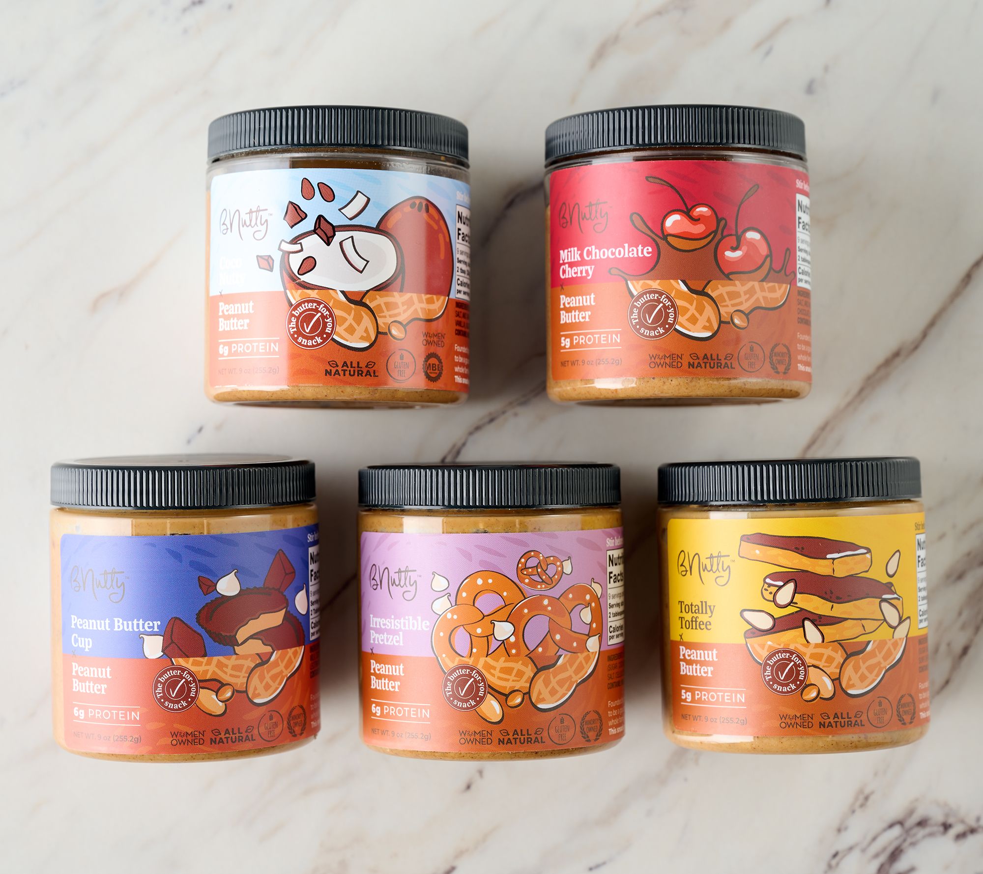 • Includes five 9-oz jars of peanut butter: one each of Totally Toffee, Peanut Butter Cup, Milk Chocolate Cherry, Coco Nutty, and Irresistible Pretzel