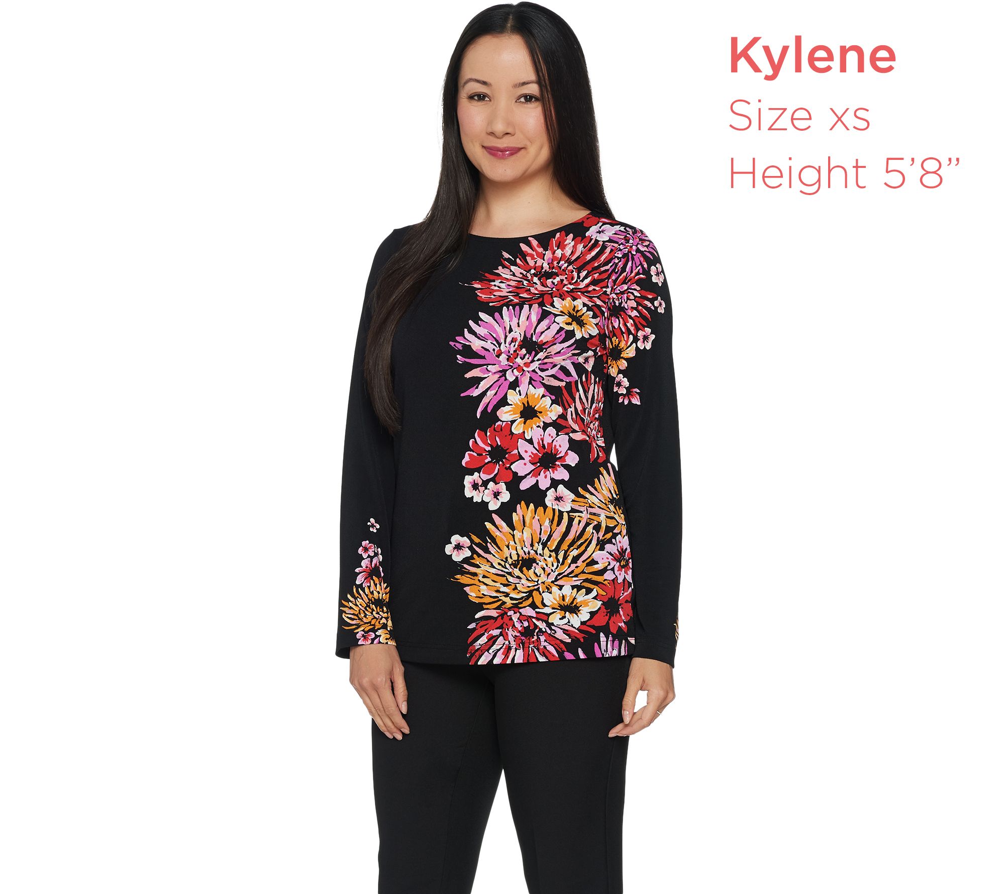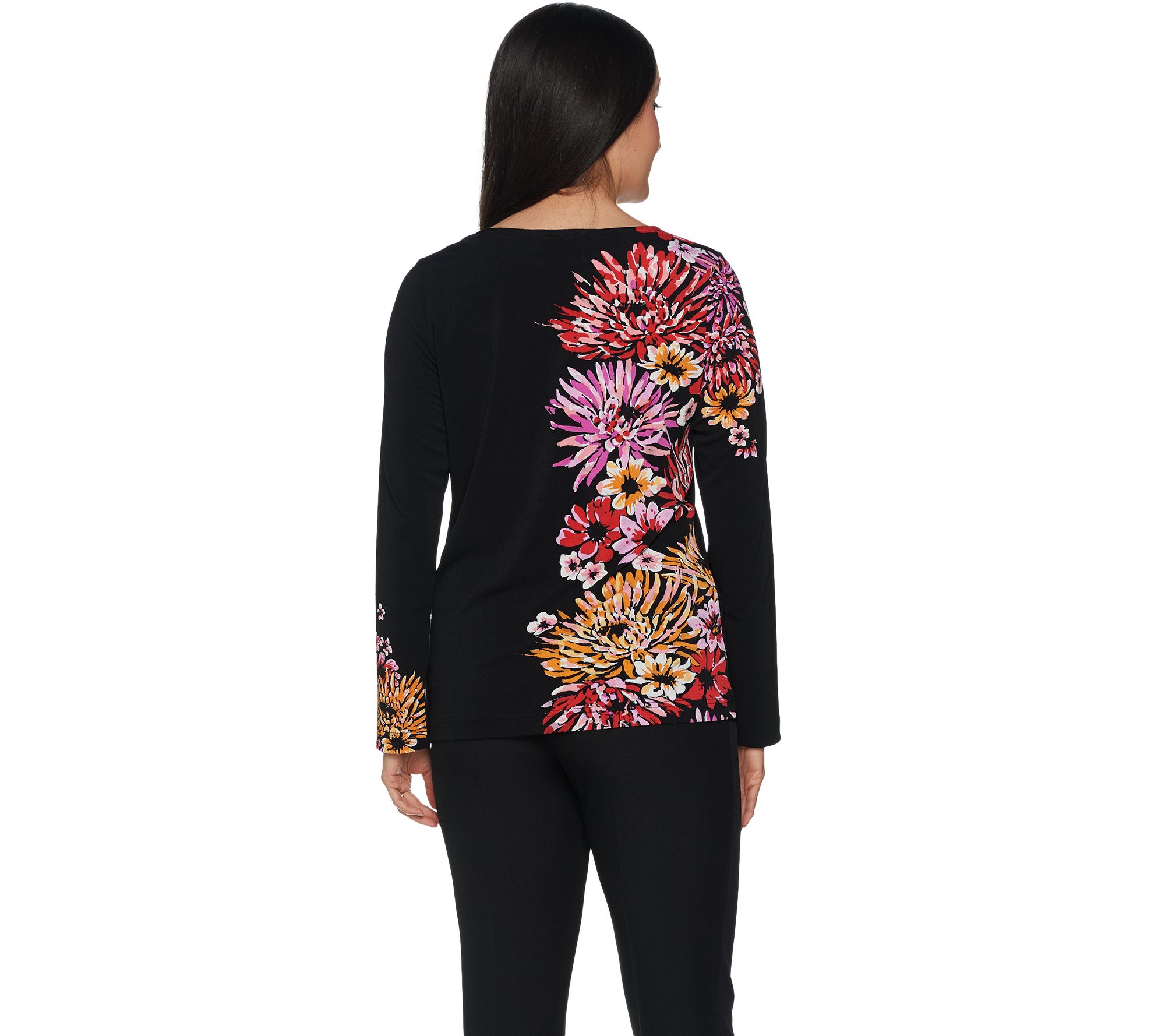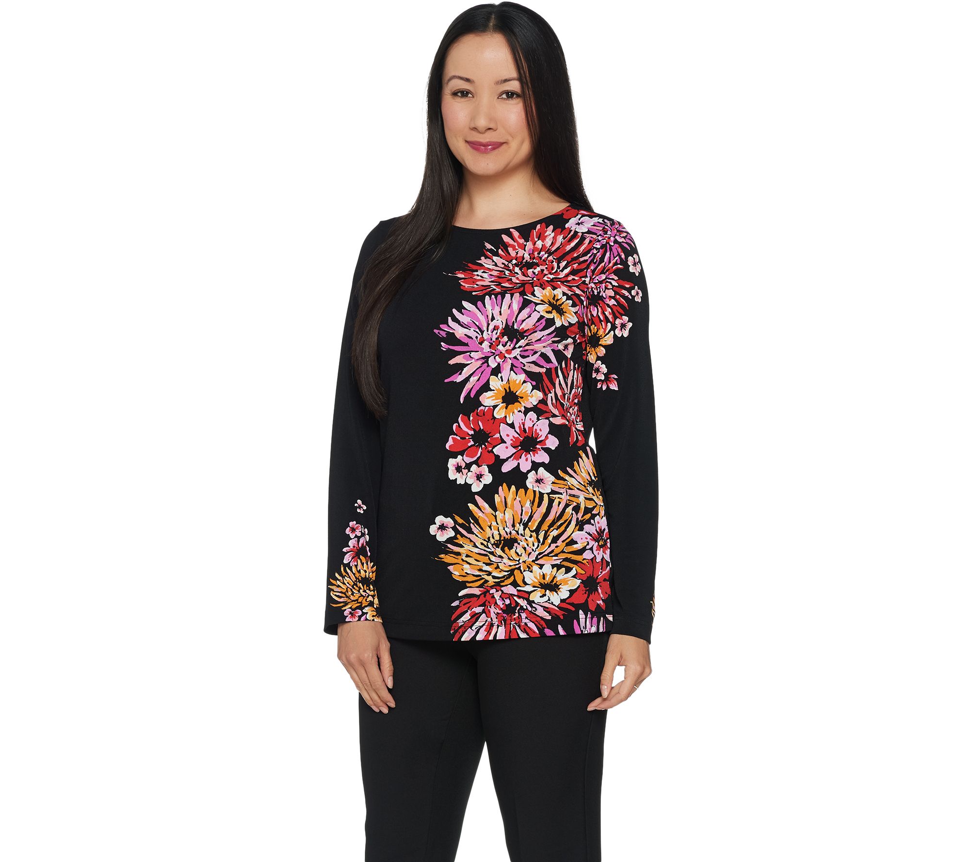 Your look is sure to pop with the pretty petals perfectly placed on this jersey top. From Bob Mackie.