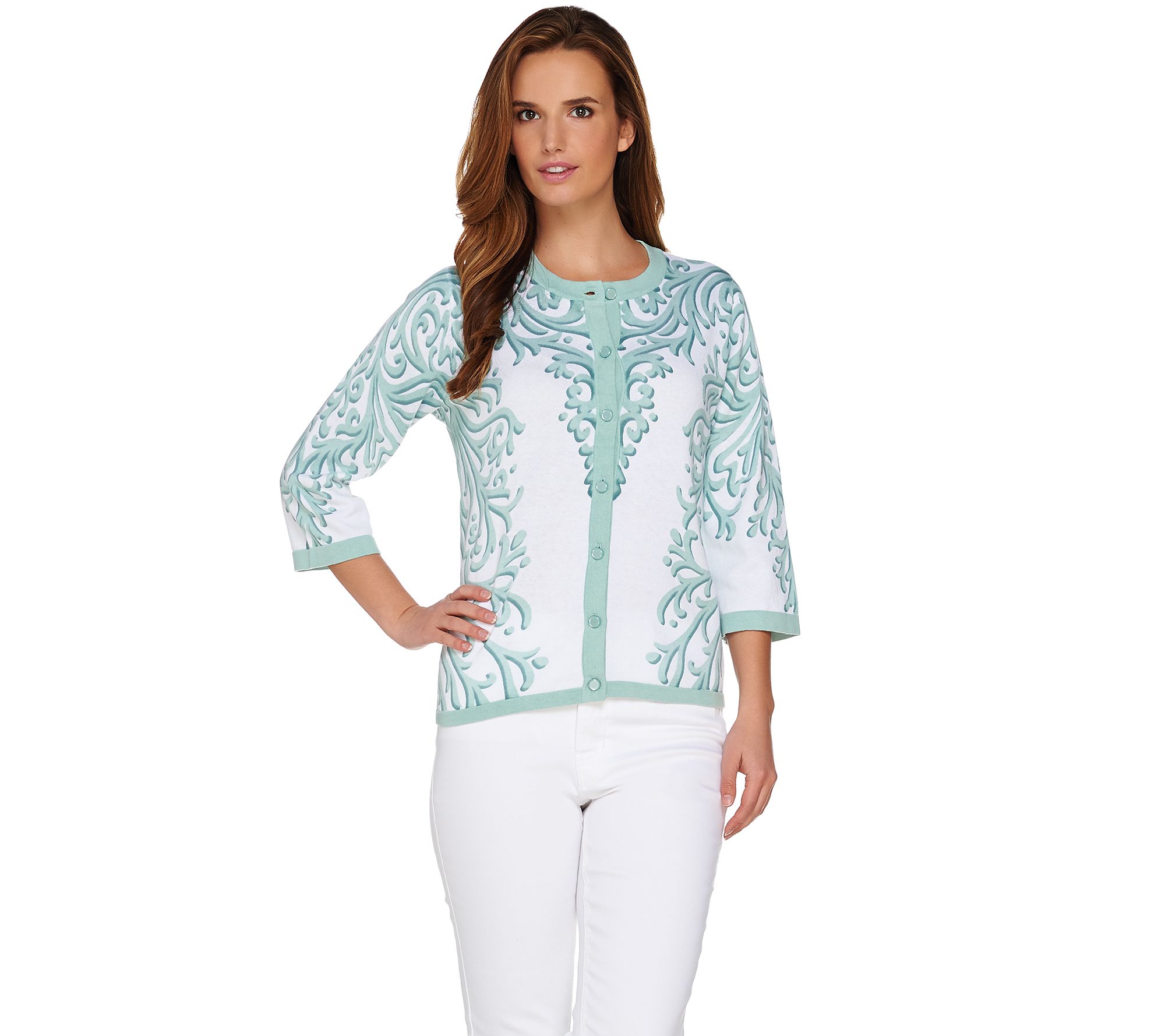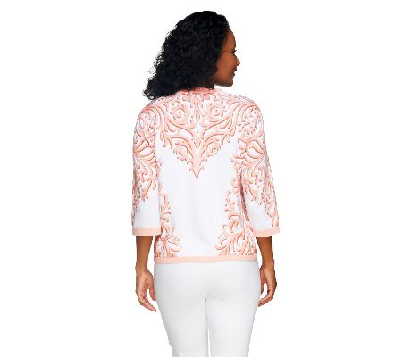 This Roccoco printed cardigan by Bob Mackie fuses the ornate curves used in French art with modern fit and function. Featuring seasonless 3/4-length sleeves, the cardigan is also fashioned with a curvy, asymmetrical placement print that provides it with playful appeal. From Bob Mackie.
