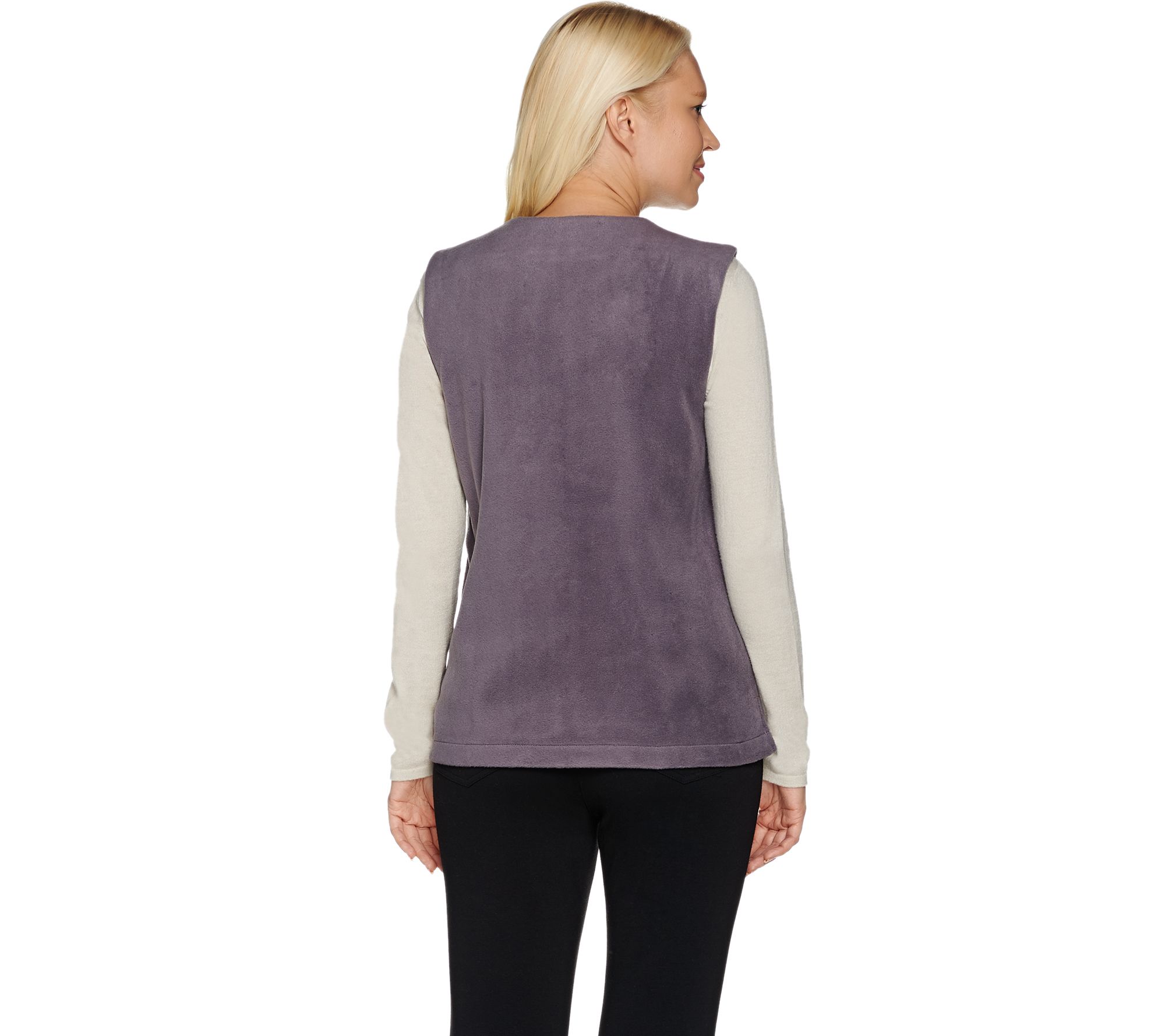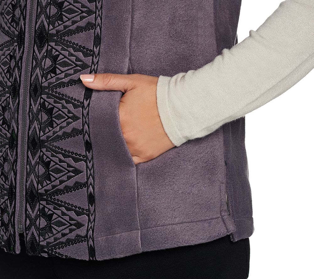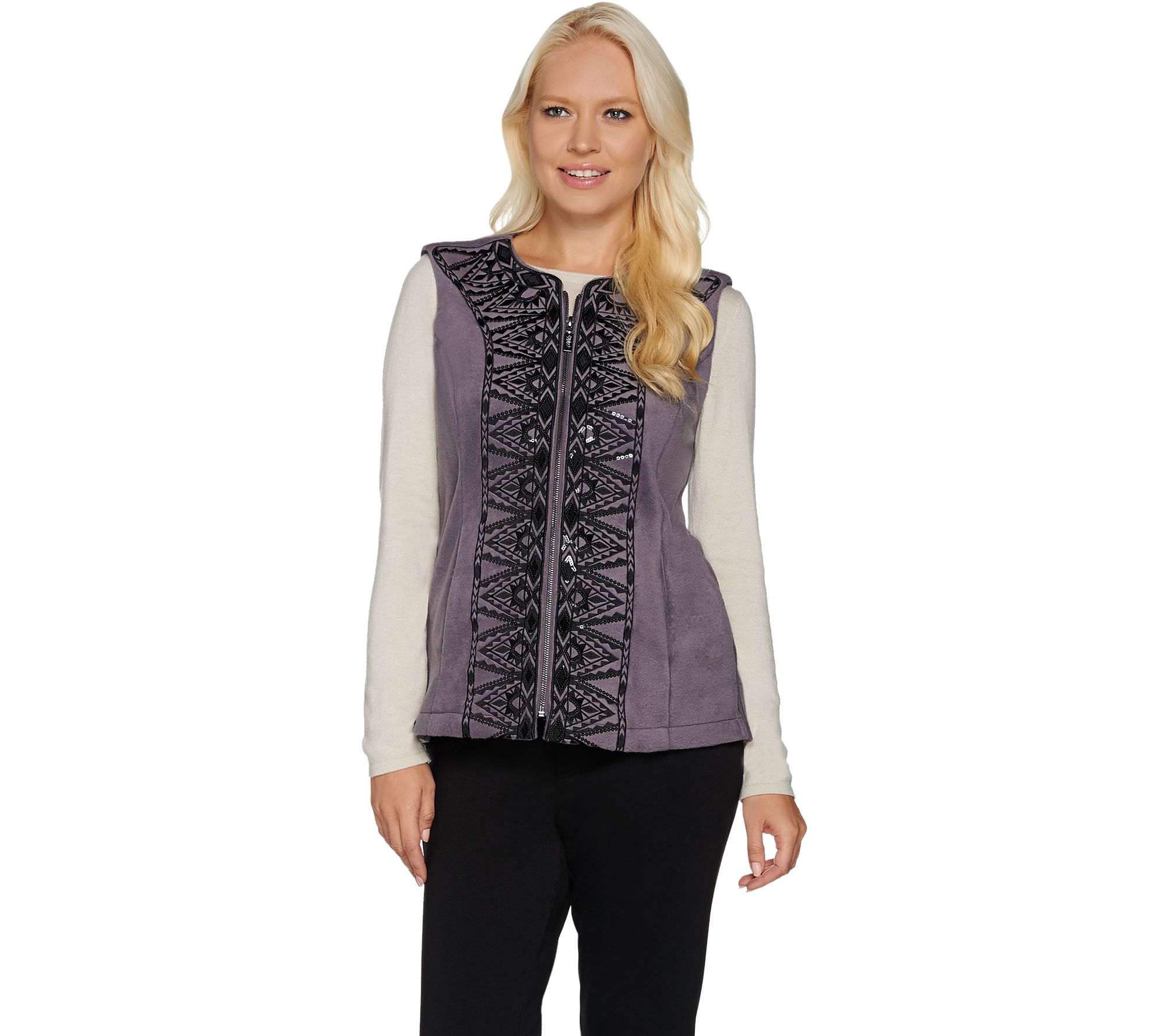 Stay one step ahead of the weather in this fleece Bob Mackie vest, a stylish way to stay warm while still enjoying the brisk outdoors. A sequined and embroidered design trails the zipper closure for an eye-catching vest with convenient pocket space. From Bob Mackie.