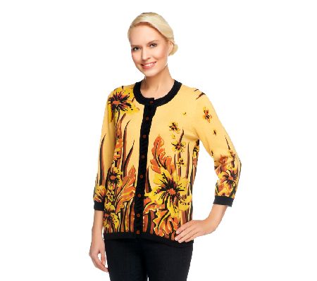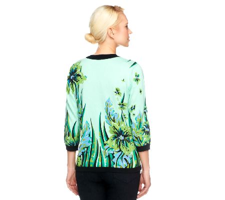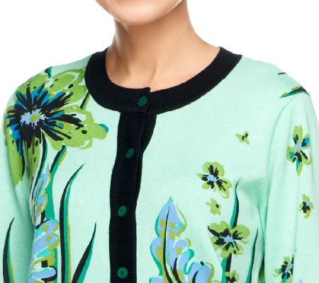 Master the art of the floral cardigan. A placement print, solid trim, and 3/4-length sleeves make this sweater a classical, yet contemporary creation. From Bob Mackie.