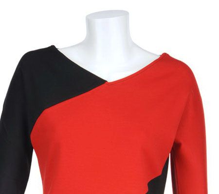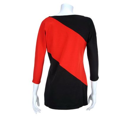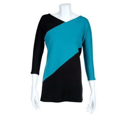 Block-solid. Look at color in a new way with this V-neck tunic. The streamlined silhouette has an color-block design, a fabric with an easy stretch, and a modern sleeve. From Bob Mackie.