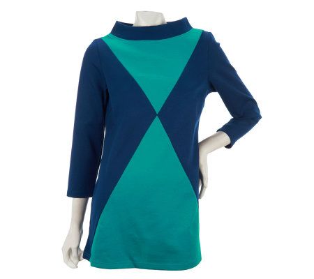 Flaunt your fun side when you wear this tunic. A funnel neck, bracelet sleeve, and contrasting blocks of color show off your carefree style. From Bob Mackie.
