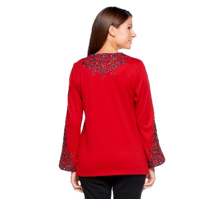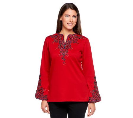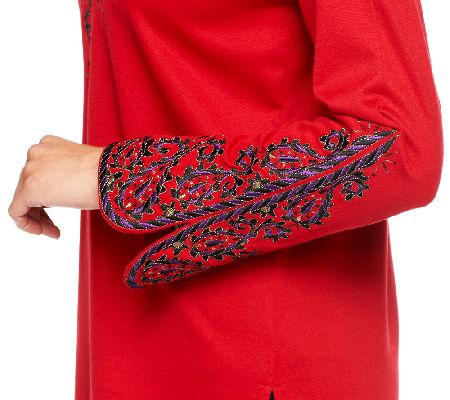 International inspiration. Add exotic flair to your wardrobe with this richly embroidered, knit Bombay tunic. From Bob Mackie.