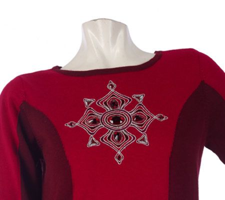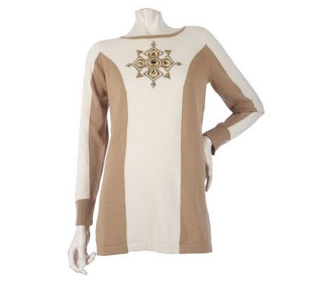 Bob Mackie's Embroidered Jewel Medallion Colorblock Sweater