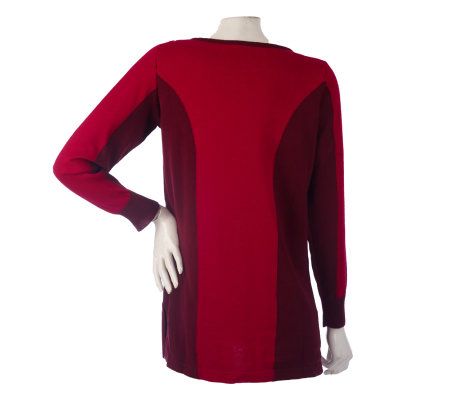 The jewel of your wardrobe. A stunning embroidered jewel medallion makes this bold and vibrant colorblock sweater one you'll truly treasure. Rib trim and a jewel neckline round out the standout style. From Bob Mackie.