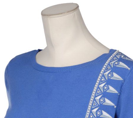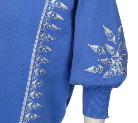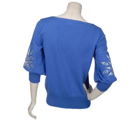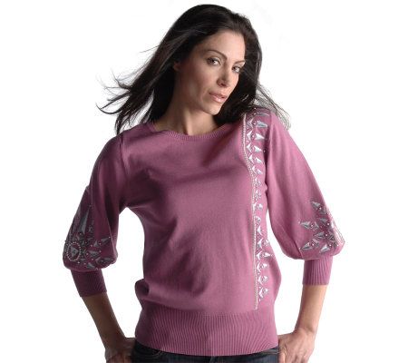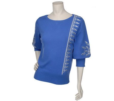 Fashion by design. Powerful lines give this embroidered and jeweled sweater head-turning appeal. From Bob Mackie.